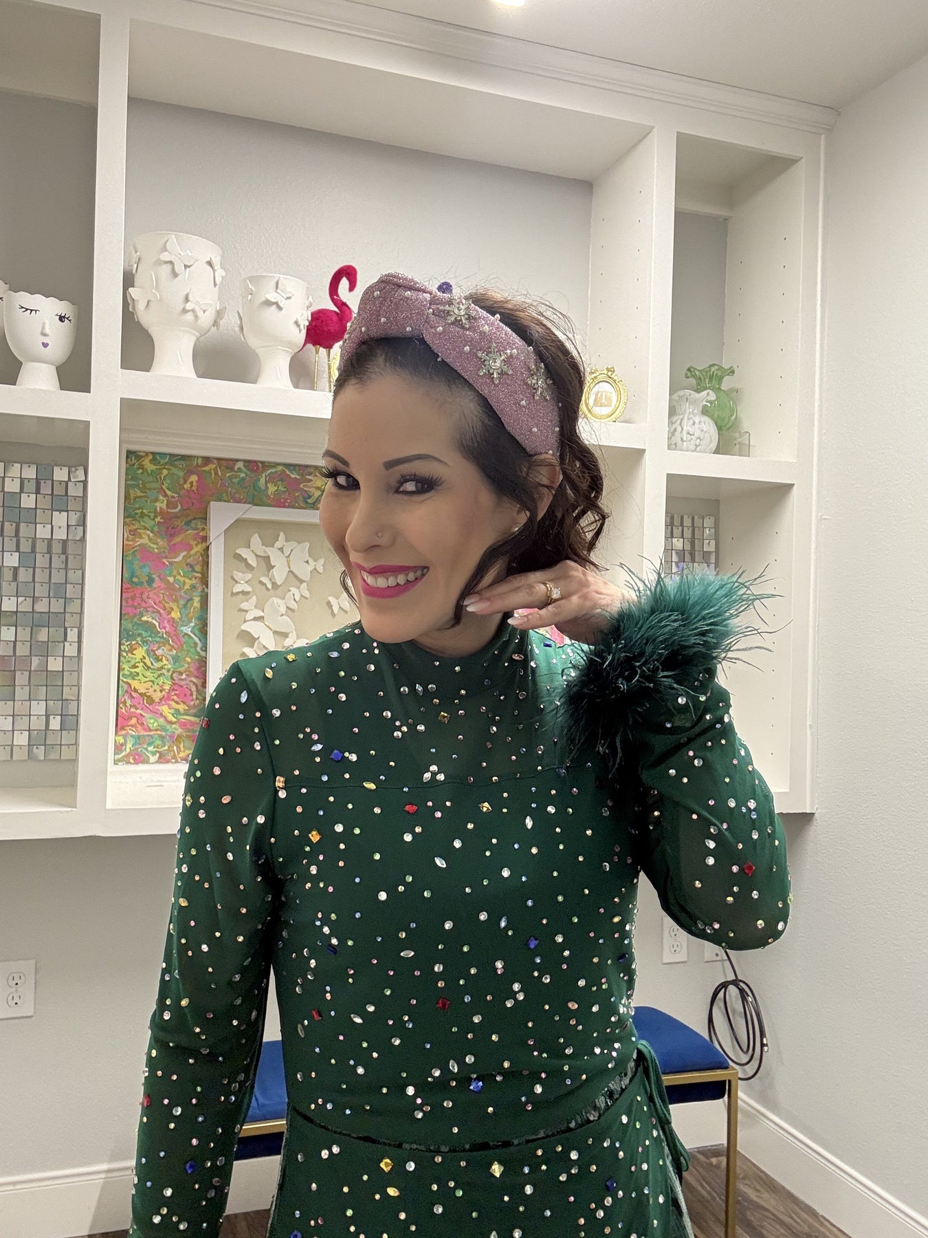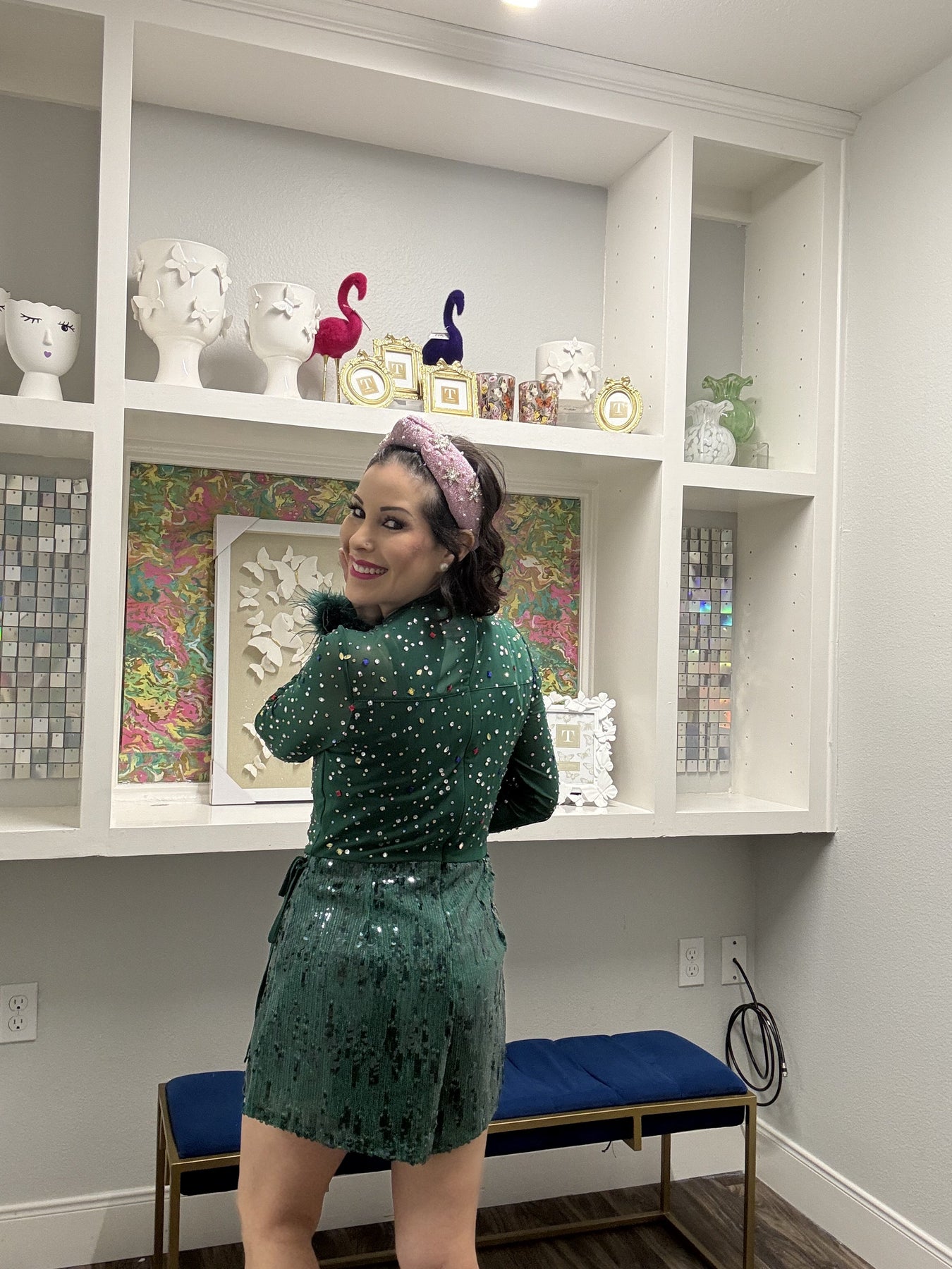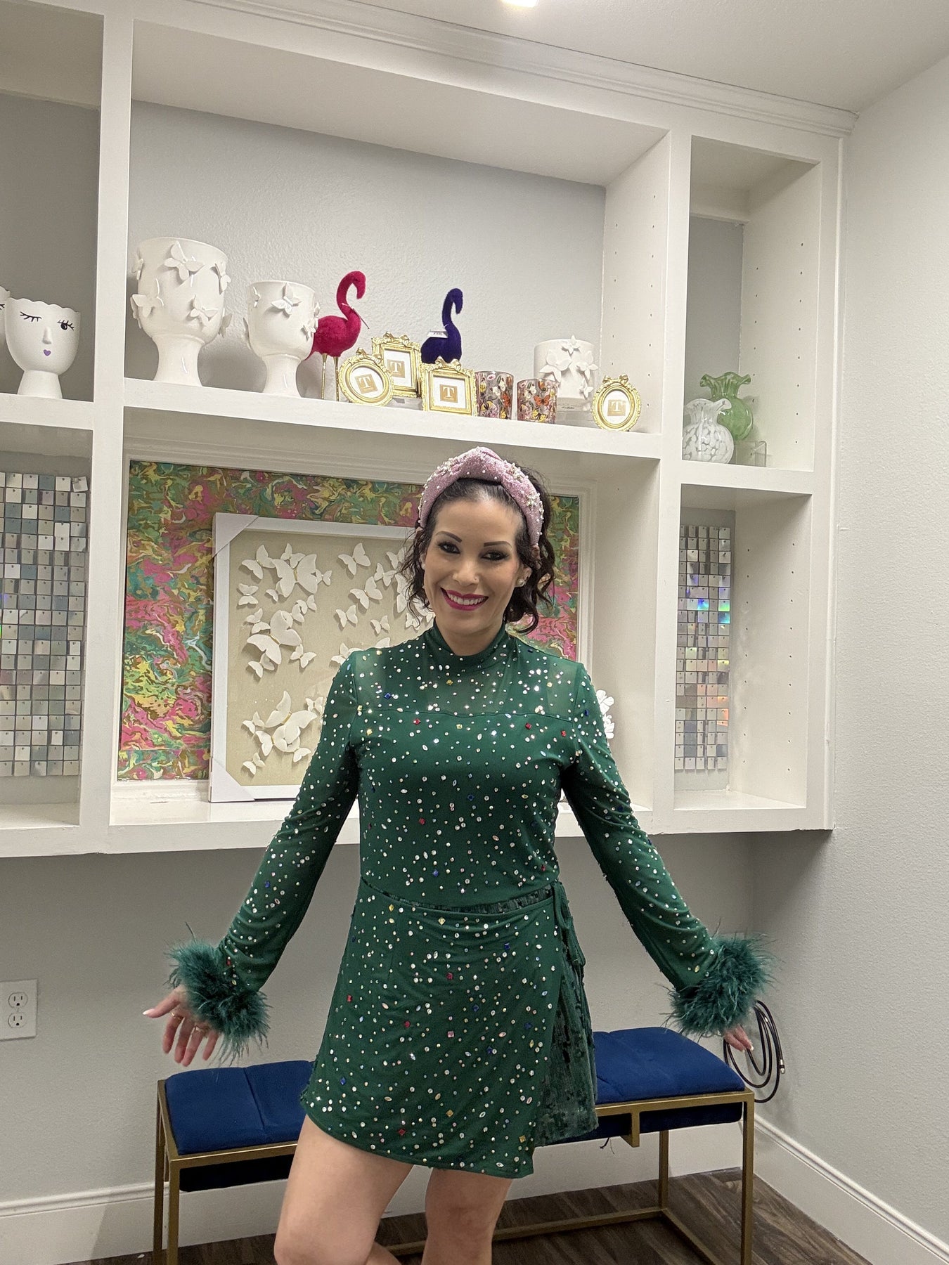 Slip into pure glamour with this show-stopping emerald romper that's ready to turn heads. Feathered sleeves add dramatic flair while cascading rhinestones and sequins catch every light on the dance floor. The tailored short cut keeps things chic and comfortable, perfect for nights when you want to shine without trying too hard. Whether you're hitting the club or stealing the spotlight at a party, this piece delivers maximum sparkle with effortless style. Get ready to own the room! Model is wearing an XS
