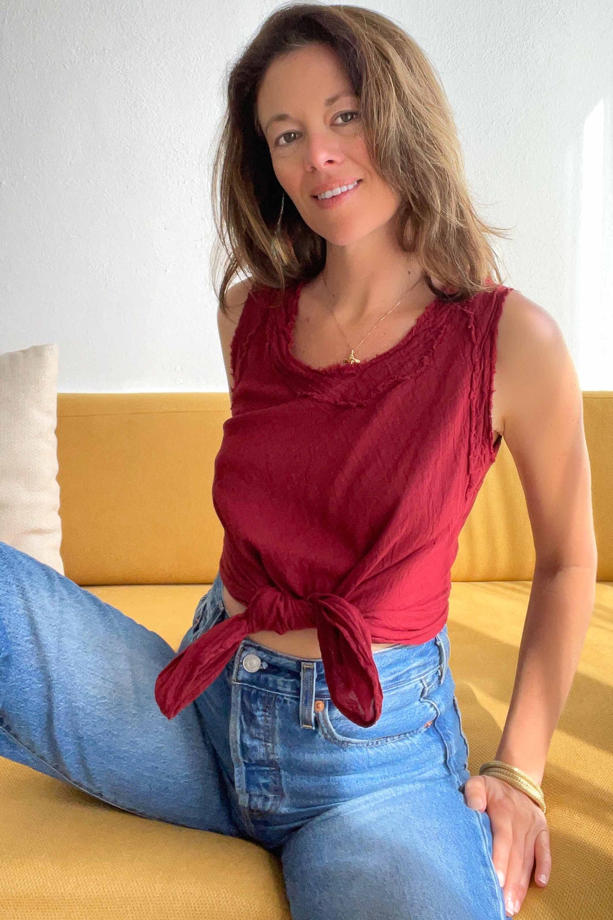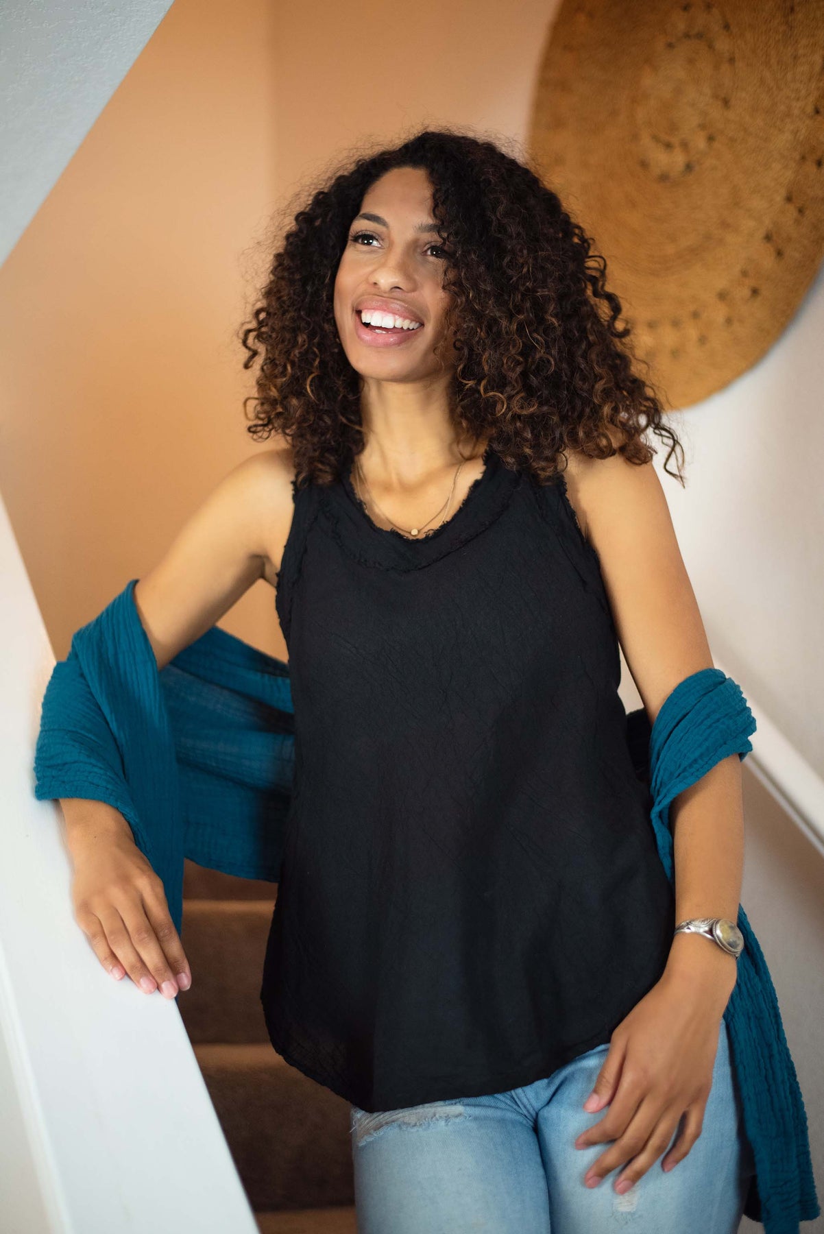 Truly flattering to the hips and makes natural stone jewelry pop. Raw edges around the neckline give a rustic handmade feel. Soft, breathable, weightless. Made of 100% gauzy woven cotton.