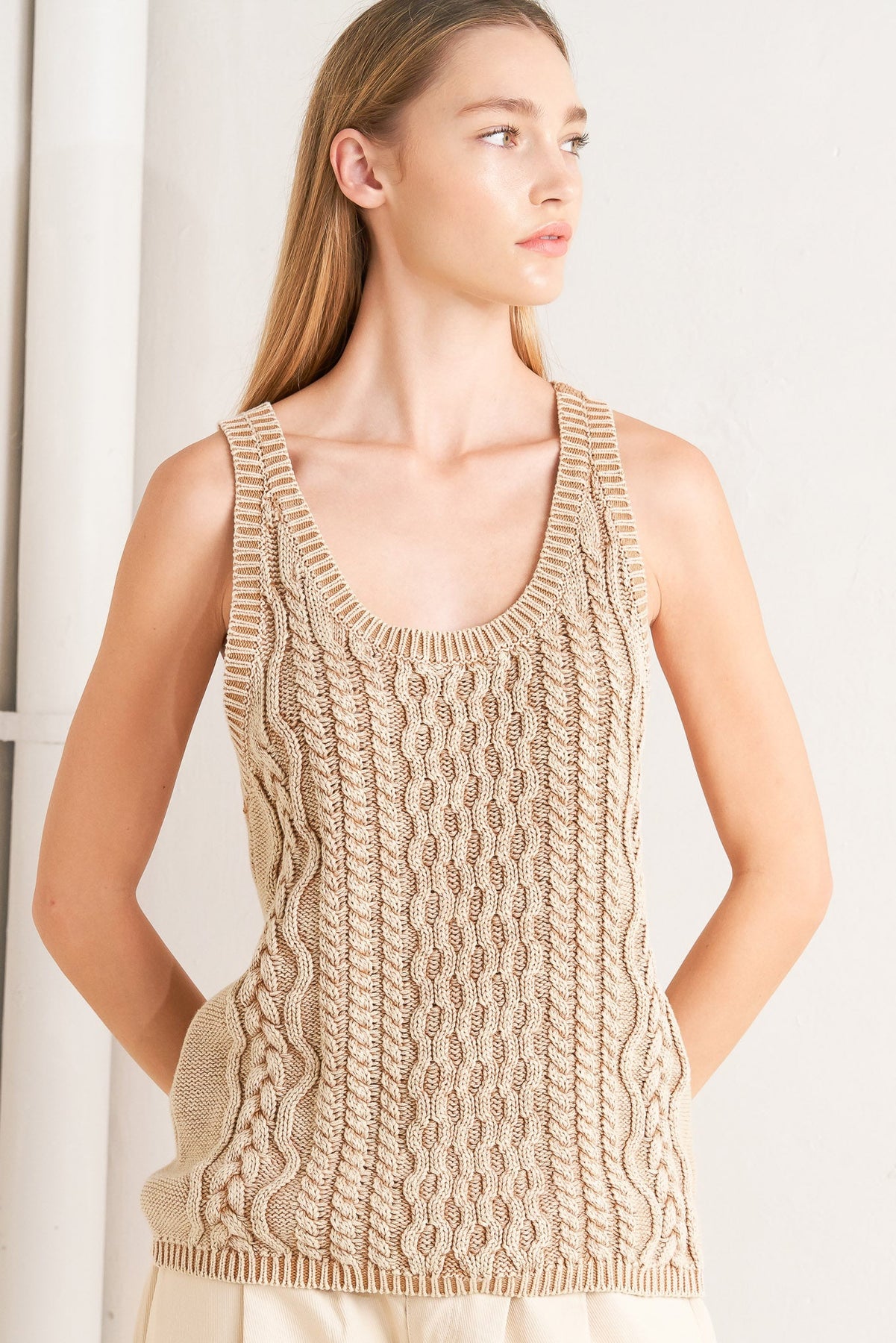 A washed sweater knit tank top featuring U neckline and sleeveless