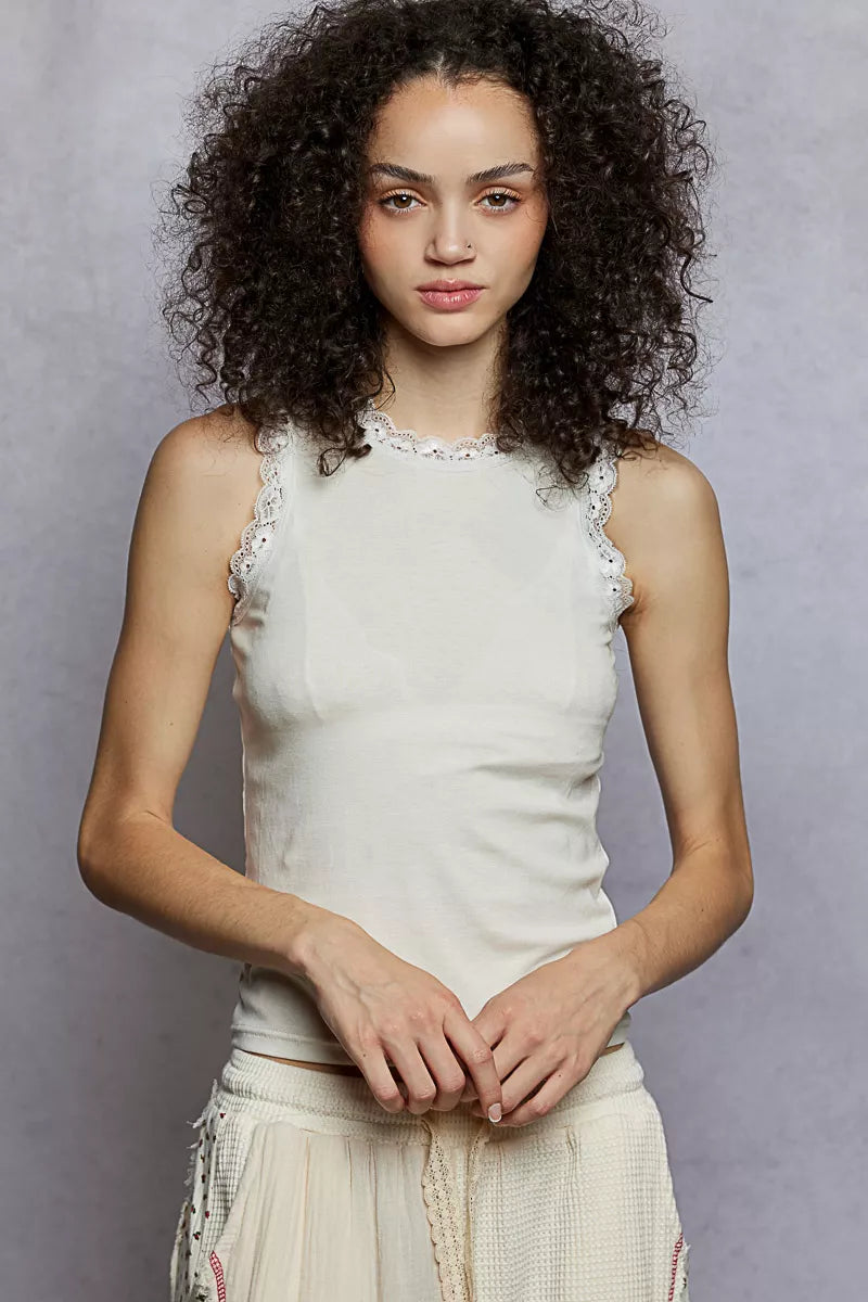 This top features a round neck and a fitted sleeveless silhouette, made from comfortable jersey fabric. It is adorned with elegant lace trim details. The design offers a sleek and flattering fit. Perfect for layering or wearing on its own, this top is versatile for various occasions.