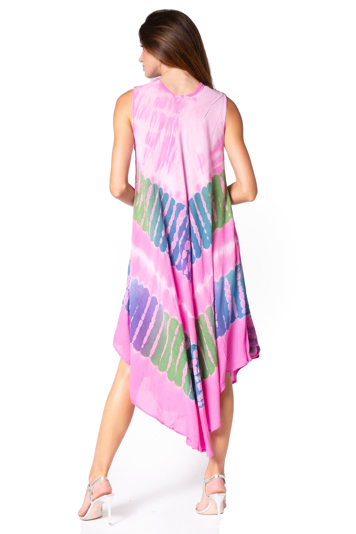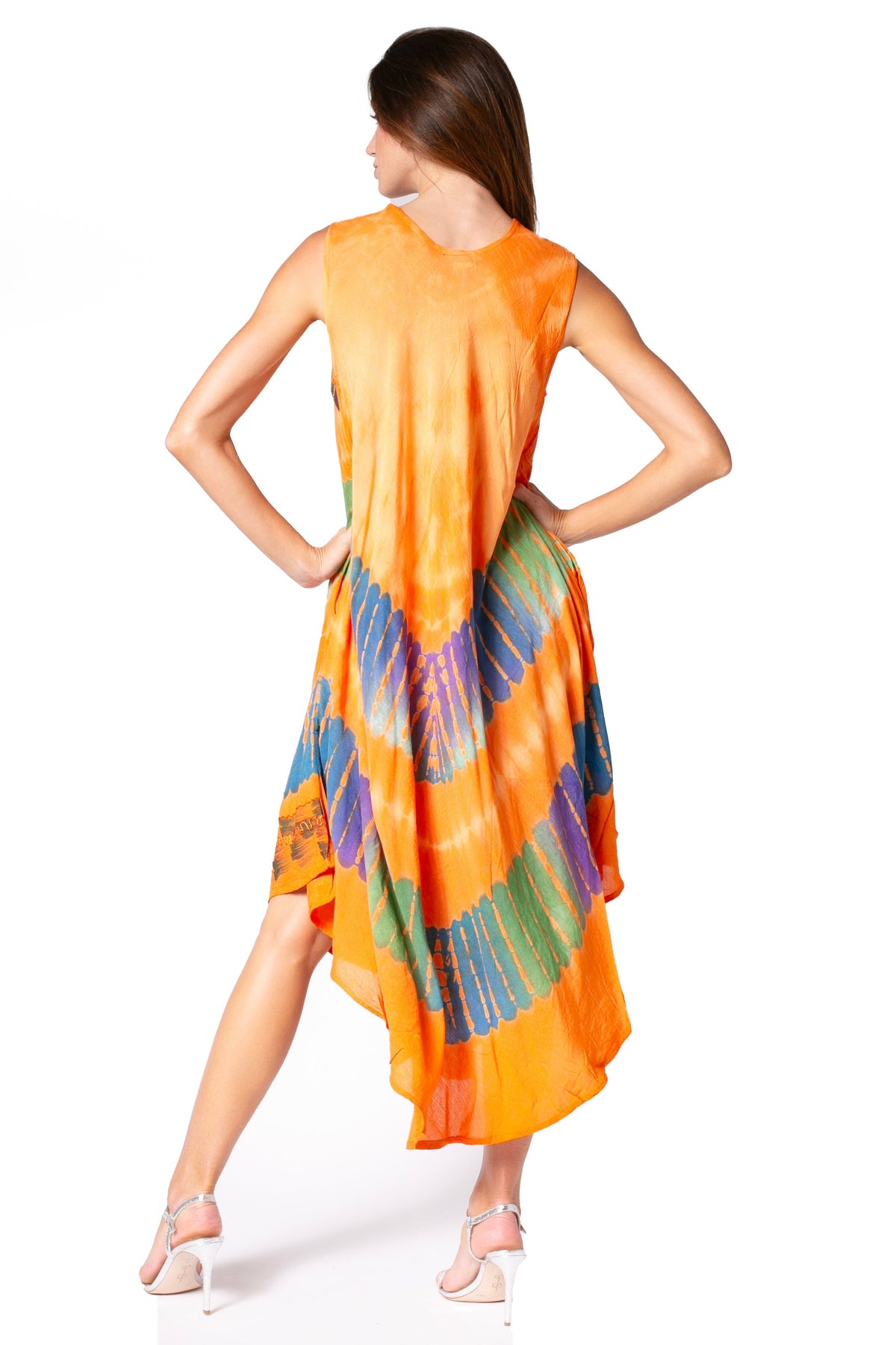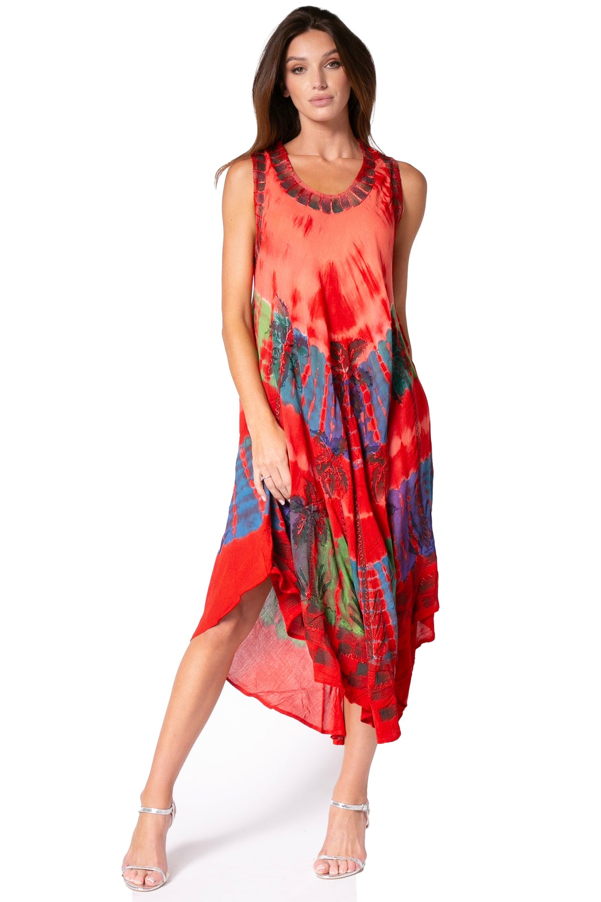 • Sleeveless caftan dress features unique tie dye design, embroidered details and relaxed fit.