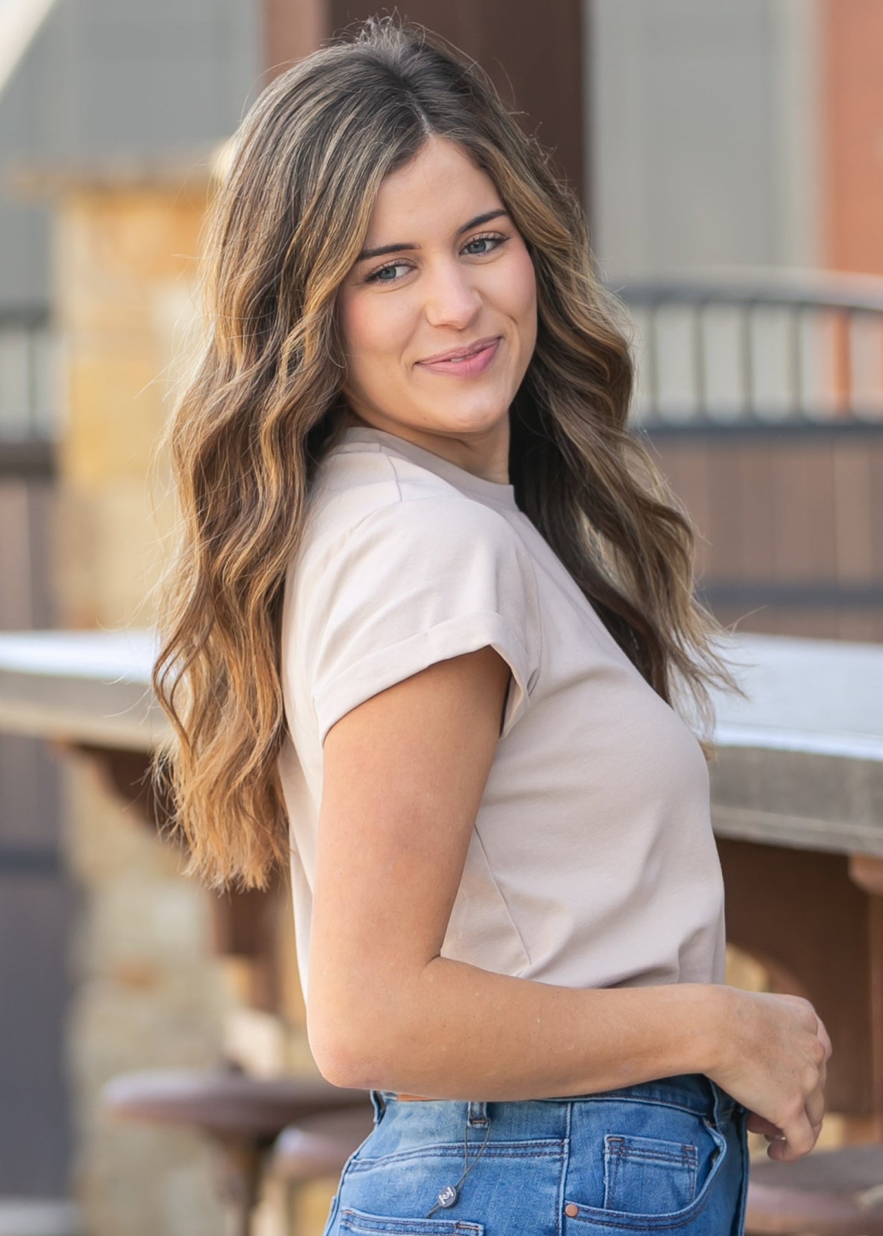 The Short Sleeve Essential Basic Tee is an Inherit Design that requires NO layering! This elevated top is designed in a feminine fit with a round bottom hem. The bottom hem in the back is 2" longer than the one in the front for added coverage! You'll feel comfortable wearing this solo, as it is not tight, or layered with your favorite denim jacket or cardigan! The rolled sleeves add a touch of detail to finish off this must-have tee!