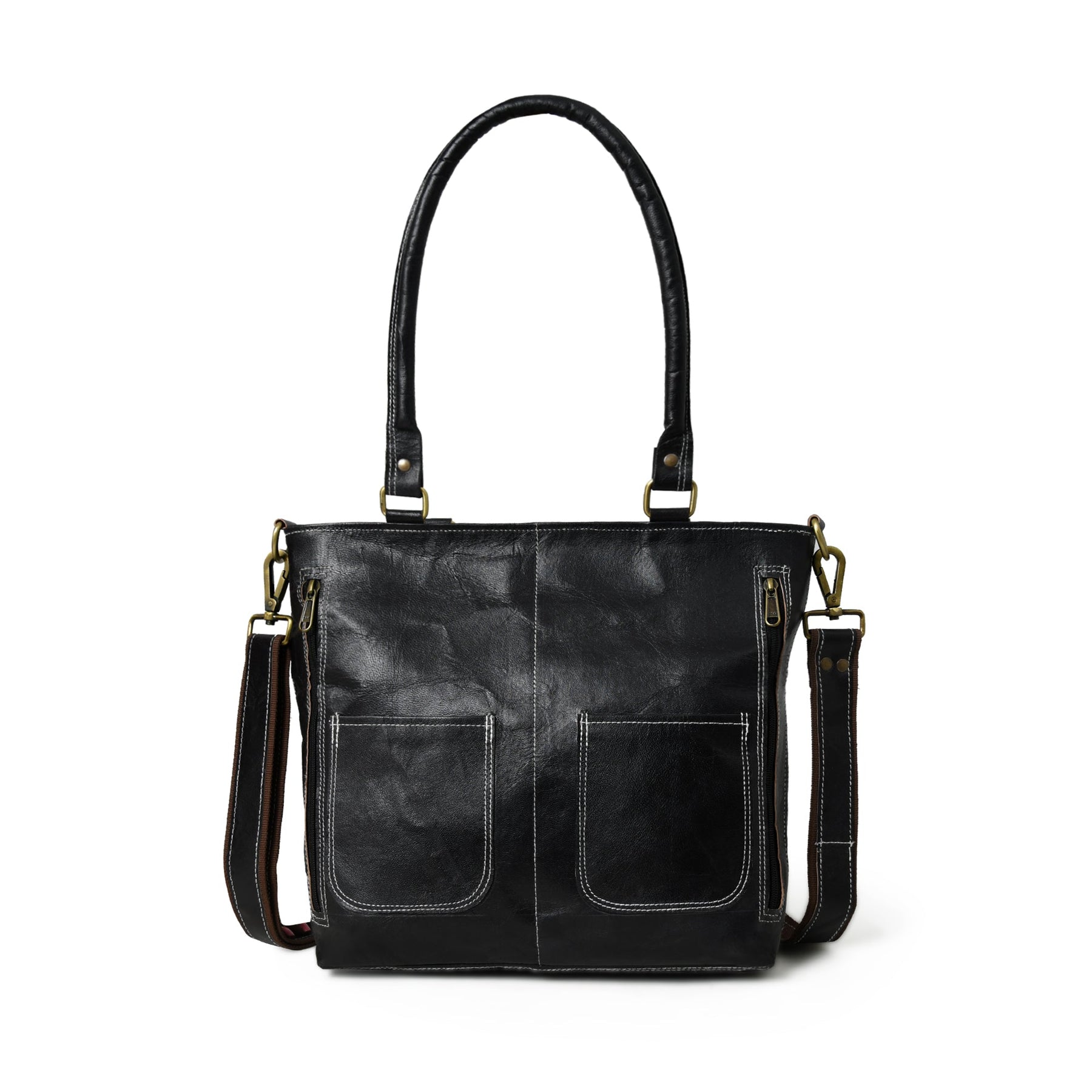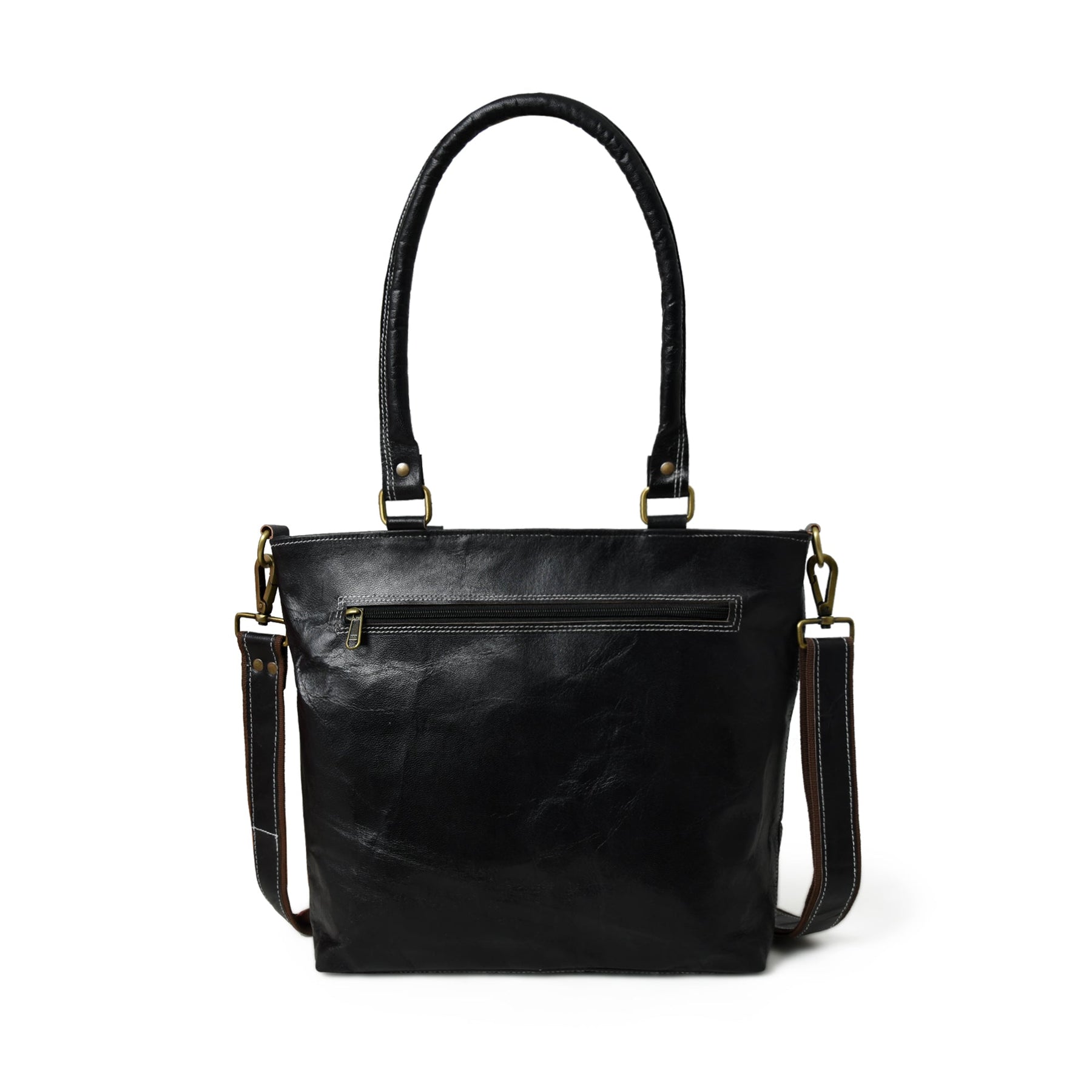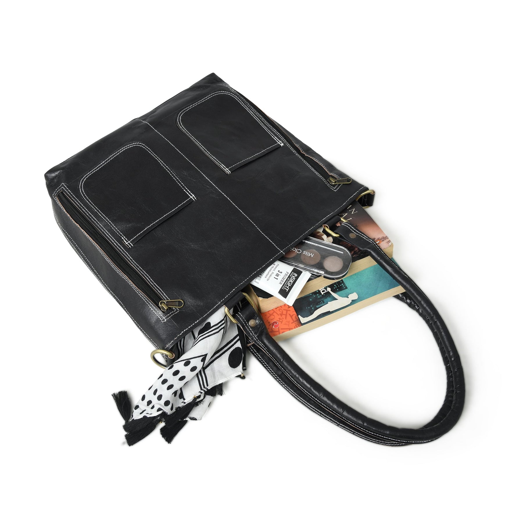 This women's shoulder leather tote bag has a distinctive smell that fades away within a few days of use. With classic black color it gives a smart appeal to any look.