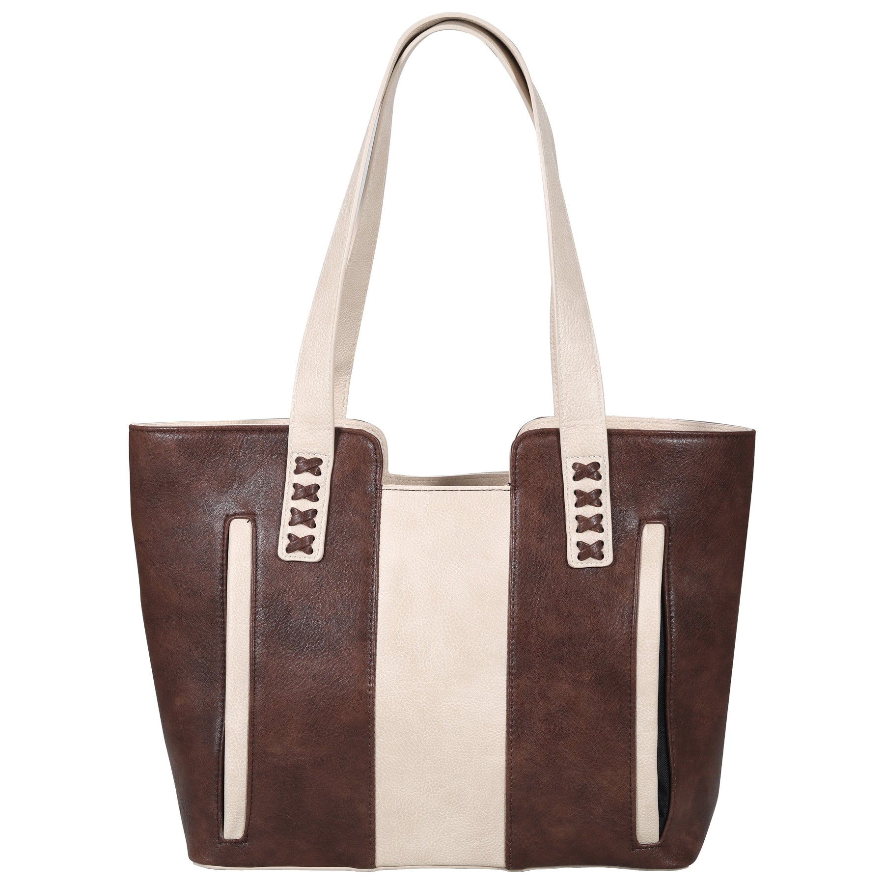 Designed with safety and ease of access in mind, the Wrenly Tote features a discreet concealment pocket located on the back of the bag, secured with magnetic closures for a faster, smoother draw. The concealed compartment is constructed of durable, wear-resistant nylon and measures 7.25" H x 7.5", accommodating most medium-frame handguns. It includes two holsters, a medium universal holster and a wraparound holster, both equipped with Velcro for a secure, customizable fit inside the concealment pocket.