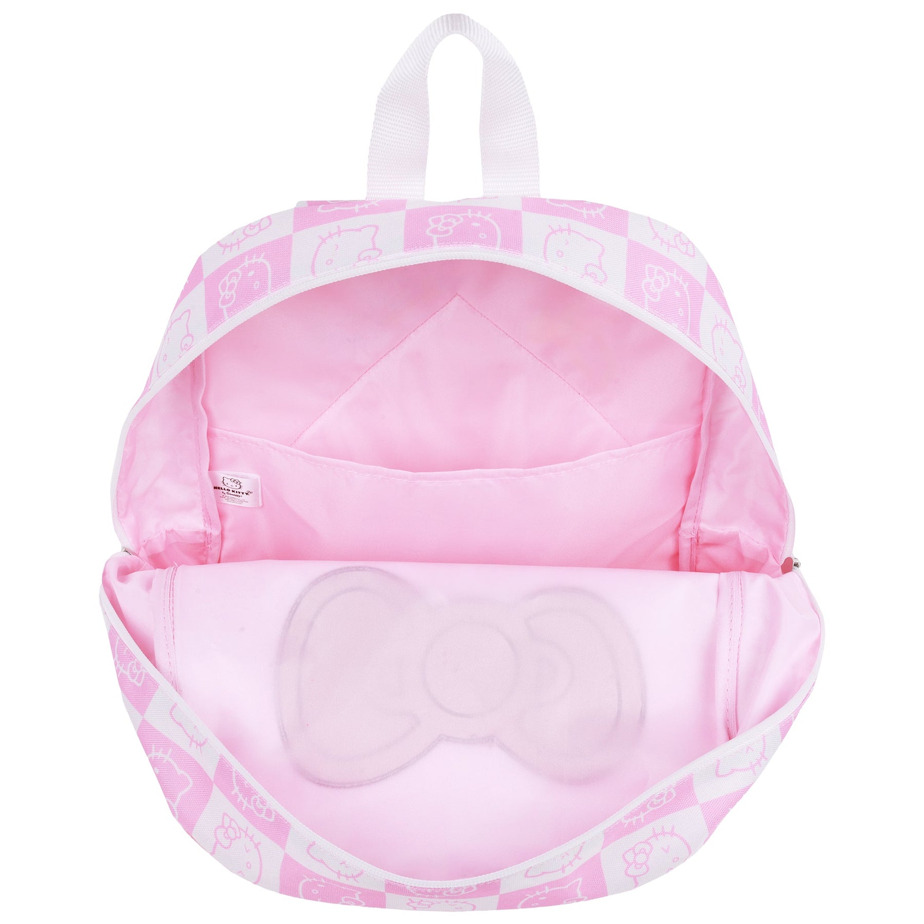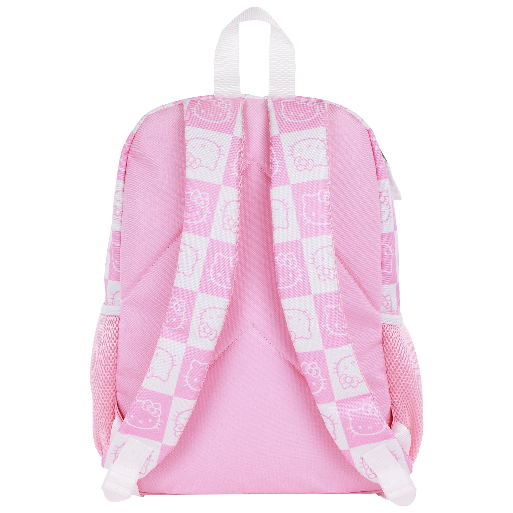 Pack your day with sweetness and style! This officially licensed Hello Kitty All-Over Print Backpack features a fun checkerboard character pattern, a shiny 3D bow patch, and an adorable Hello Kitty rubber charm. The detachable lunchbox with a matching graphic adds extra cuteness and convenience, while mesh side pockets and a roomy main compartment keep essentials organized for school or play.