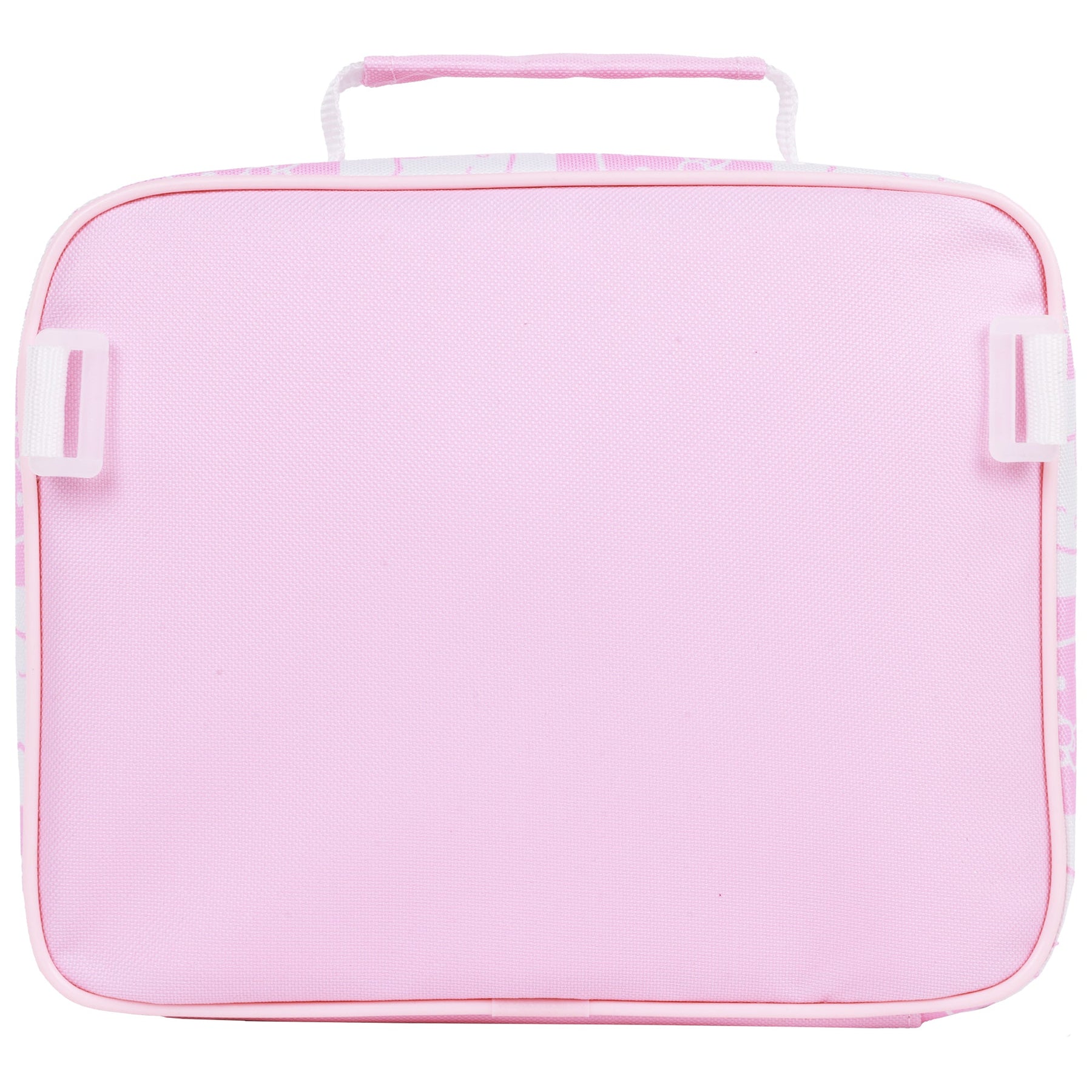 -Includes detachable lunchbox with glittery front panel 8"H x 10"W X 3"D, with Front slip pocket secured by hook and loop closure.