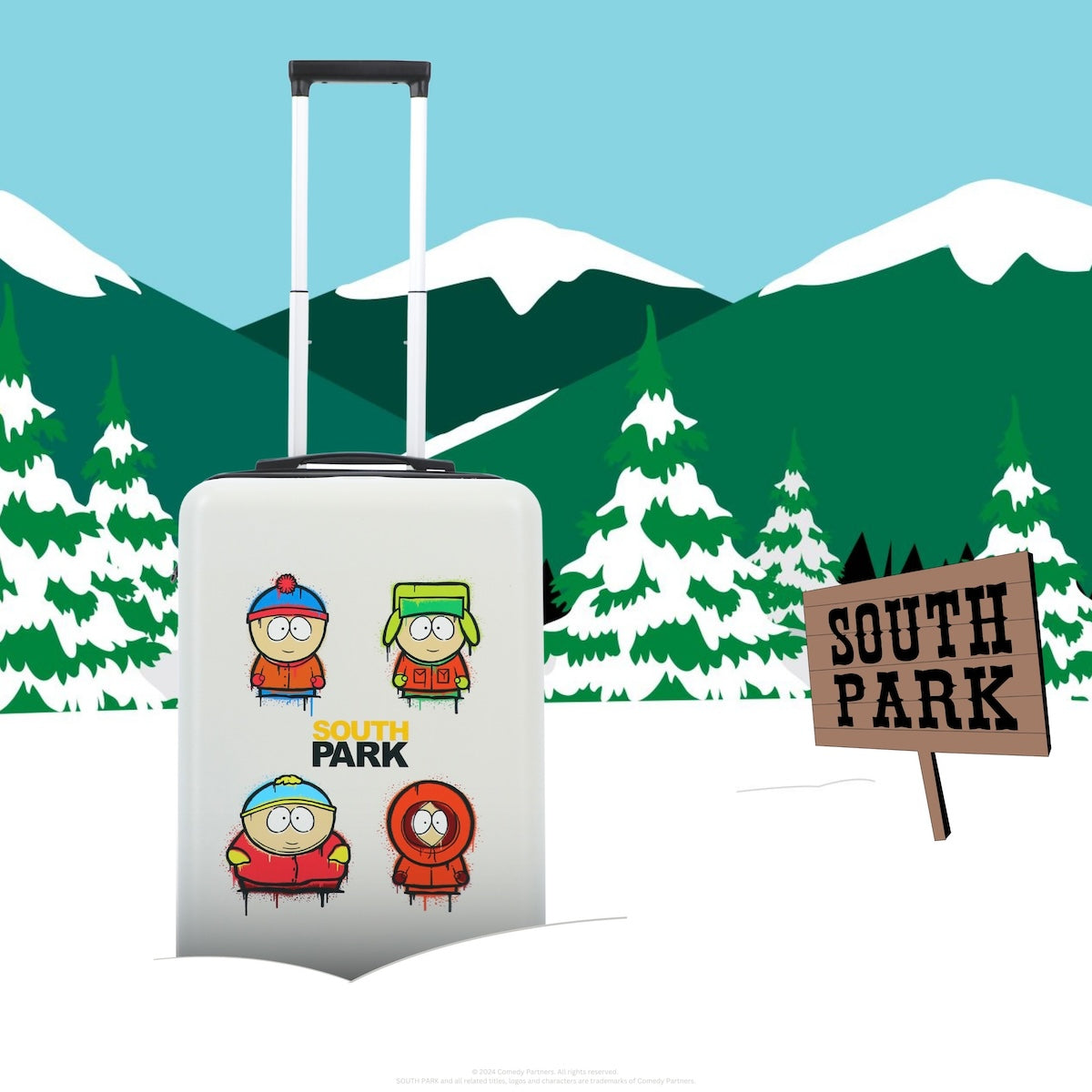 Enter the irreverent realm of South Park with the Paramount South Park Ful 22.5" Suitcase Carry-On Luggage. This luggage highlights the iconic characters from the beloved show South Park! Stan Marsh appears on the top left, Kyle Broflovski on the top right, Eric Cartman on the bottom left, and Kenny McCormick on the bottom right, all depicted in a vibrant spray paint print design! At the heart of it all, the unmistakable South Park logo stands as the centerpiece of this iconic luggage. Available in white