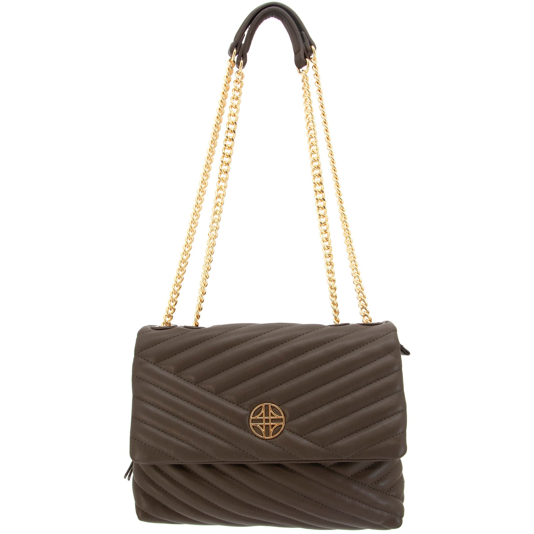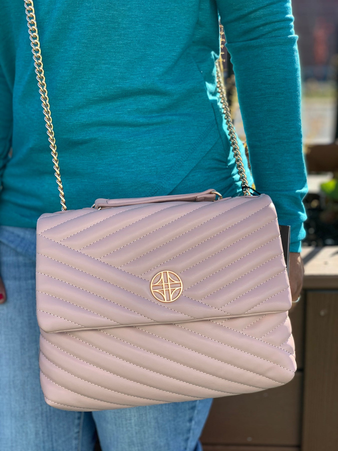 Ceres is vegan leather, quilted handbag with a half flap front, hidden magnetic snap closure, and delicate gold medallion detail. It features a unique, double handled, curbs chain strap. The continuous strap loops through the 2 sets of gold eyelets, creating the appearance of an inner and outer handle. Wear Ceres as a handbag, shoulder bag, or crossbody without adjusting a single buckle!