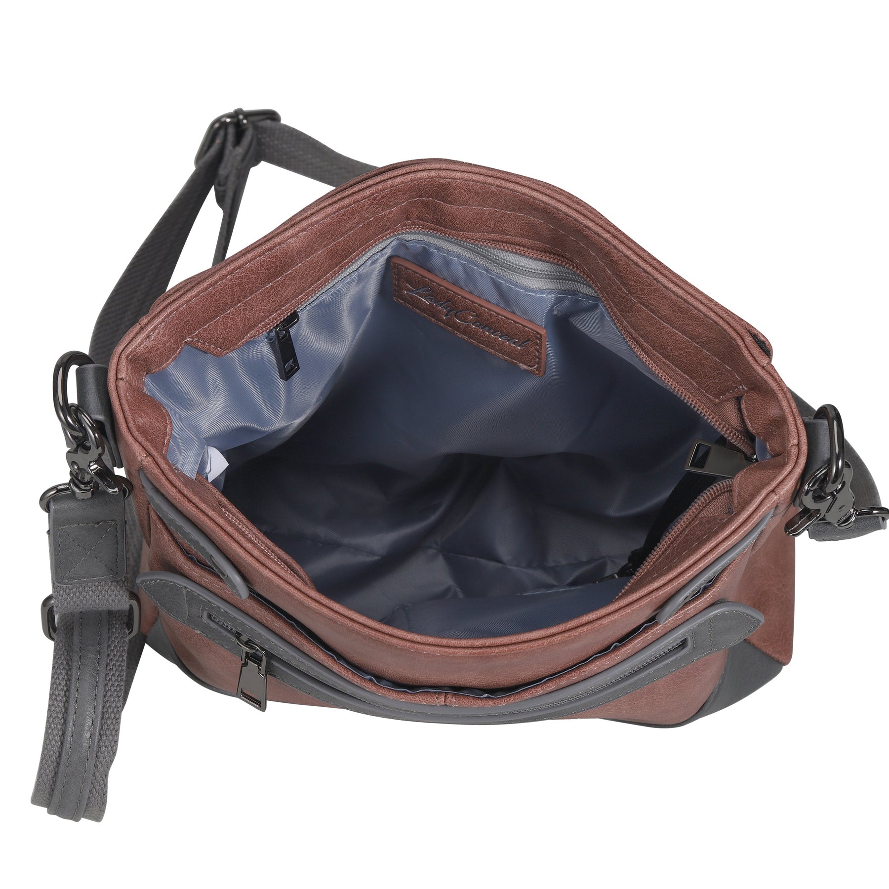 Built with safety in mind, the Addison features a discreet concealment pocket located on the back of the bag, secured with magnetic closures for a faster, smoother draw. This compartment is constructed of durable, wear-resistant nylon and measures 8.5" L x 7.25" H, accommodating most medium-frame handguns. It includes two holsters, a medium universal holster and a wraparound holster, both equipped with Velcro for a secure, customizable fit inside the concealment pocket.