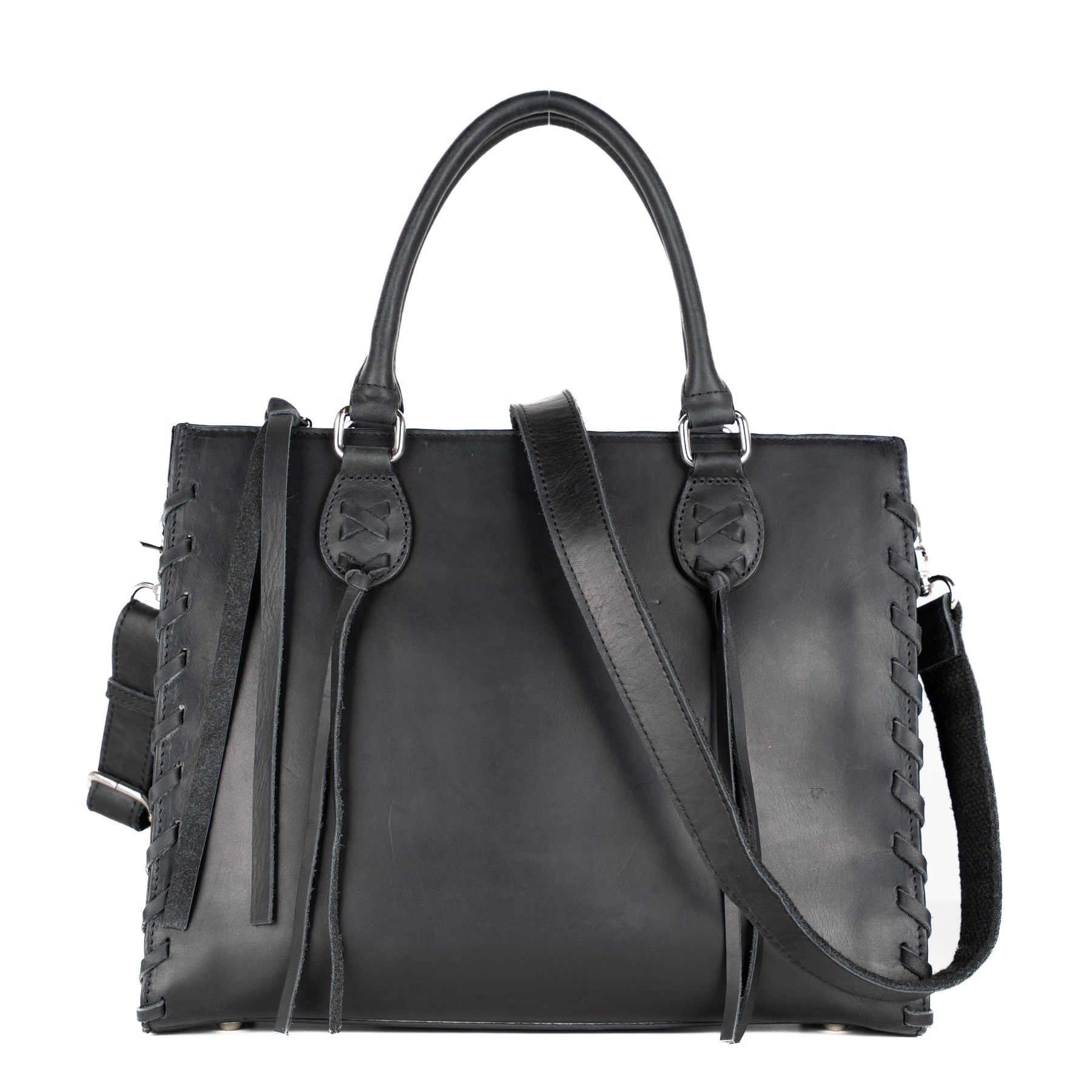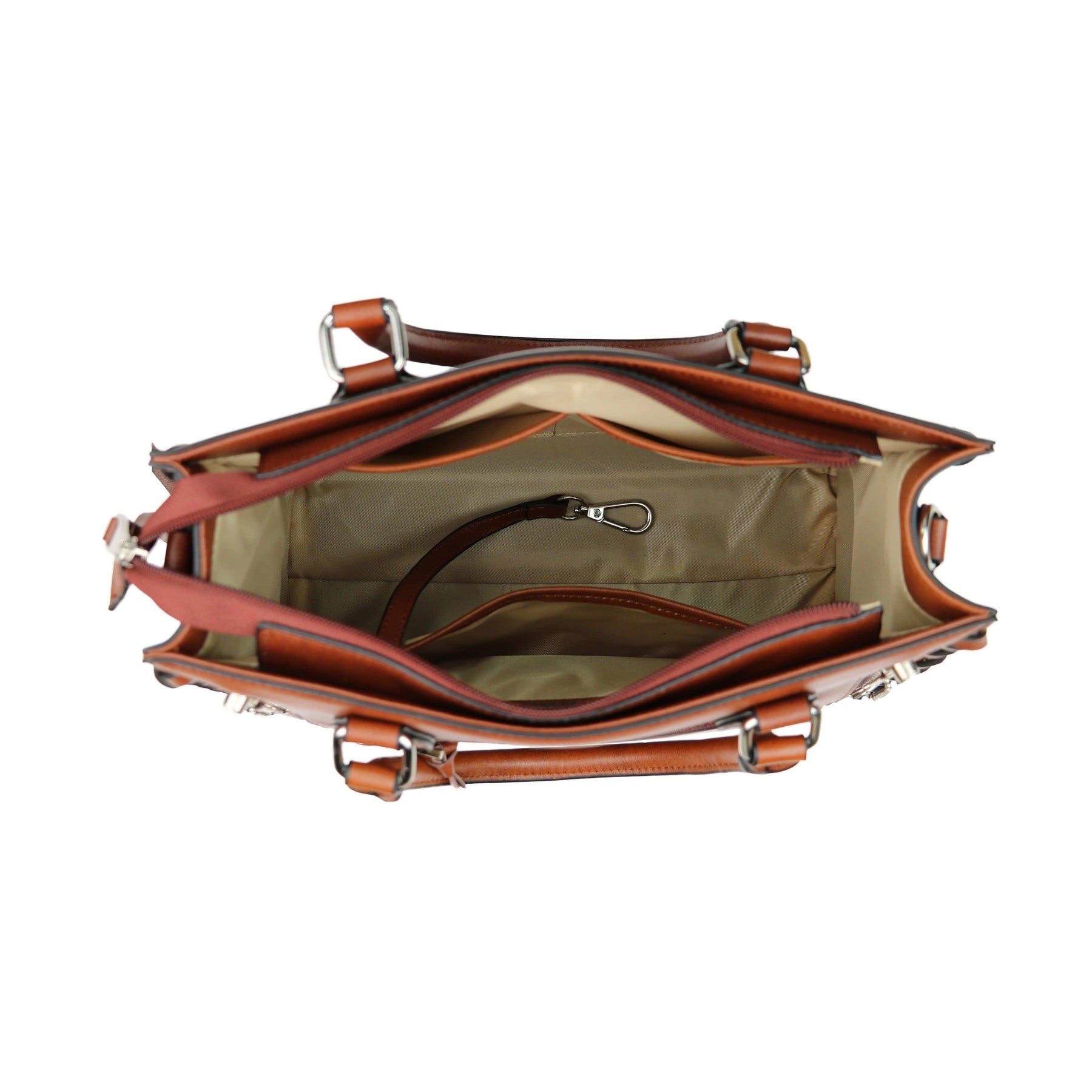 The Emma Satchel by Lady Conceal boasts fine genuine leather and meticulous craftsmanship. The laced side and crisscross knots add subtle elegance. The main interior features a zippered pocket, 2 open slip pockets, another large open pocket, and a leather key strap for immediate access to your keys. The adjustable crossbody strap easily clips on and off and measures 28” - 51” (drop 12.5” – 24”). The double handles measure 14” long with a 5” drop.