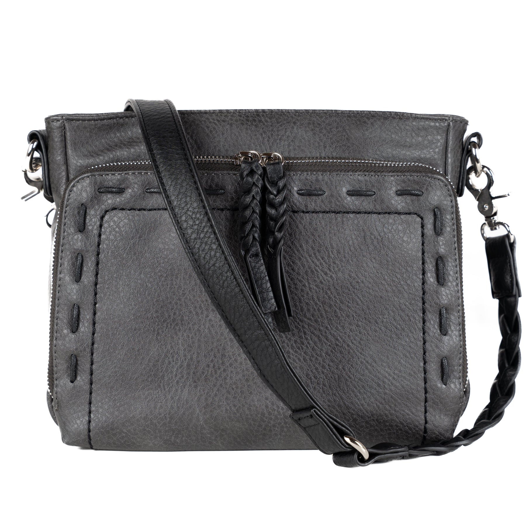 The Skylar braided organizer by Lady Conceal features soft faux leather and silver-tone hardware. The contrasting stitching, braided tabs, and braided strap exude charm. Inside the front zippered pocket is an RFID-protected organizer with 8 card slots, 1 zippered pocket and a large open pocket for your cell phone and essentials. The main interior features a zippered pocket, 2 open slip pockets, another large open pocket and a key strap for fast access to your keys. The adjustable crossbody strap measures 39”-50” (drop 18”- 24”) and easily clips on and off.