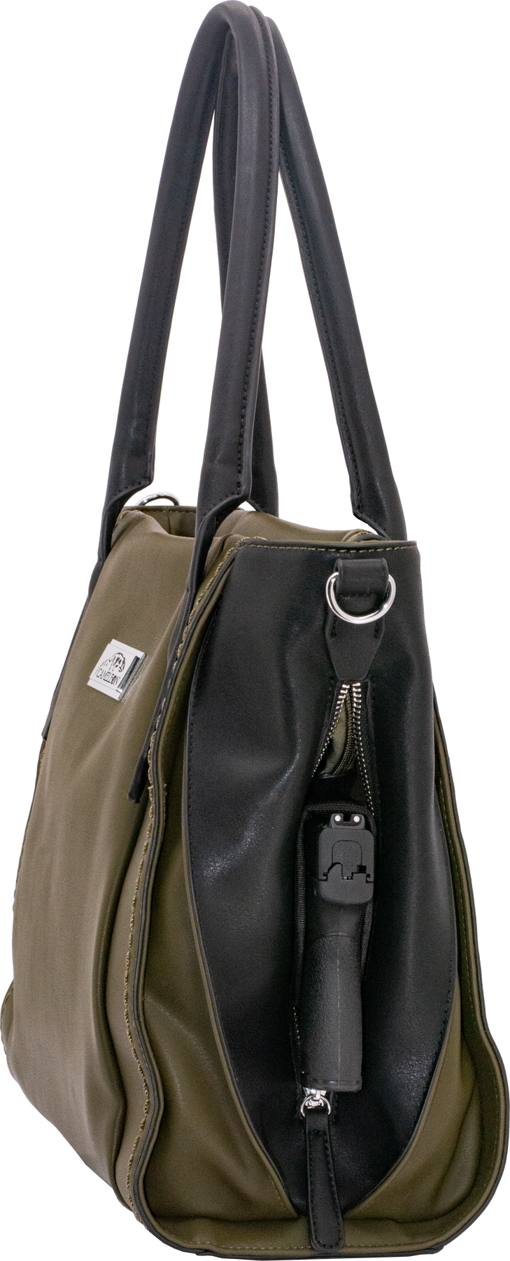 One Large Zipper Compartment with 2 open phone pockets on one size and 1 zipper pocket on the other. Reinforced Bottom with 4 metal feet. Removable and Adjustable cut resistant Crossbody strap.
