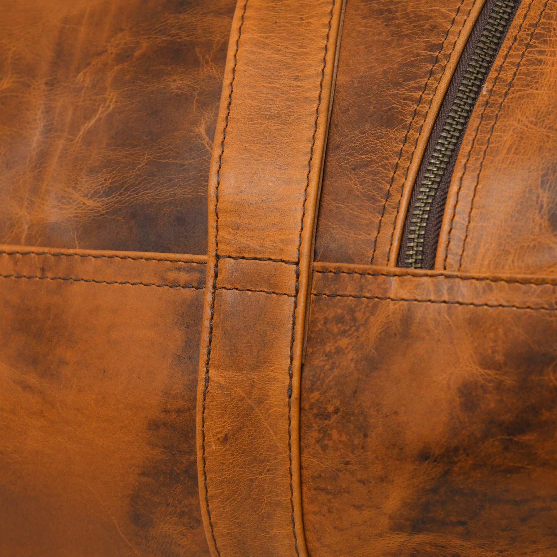 This handmade tan-brown textured buffalo leather duffle bag is the perfect way to carry your gym gear and gym wear safely. Crafted for durability, this leather gym travel bag is designed to outlast your workouts. With a unique round design and eye-catching color, this duffle bag is perfectly edgy and makes your gym life easy.