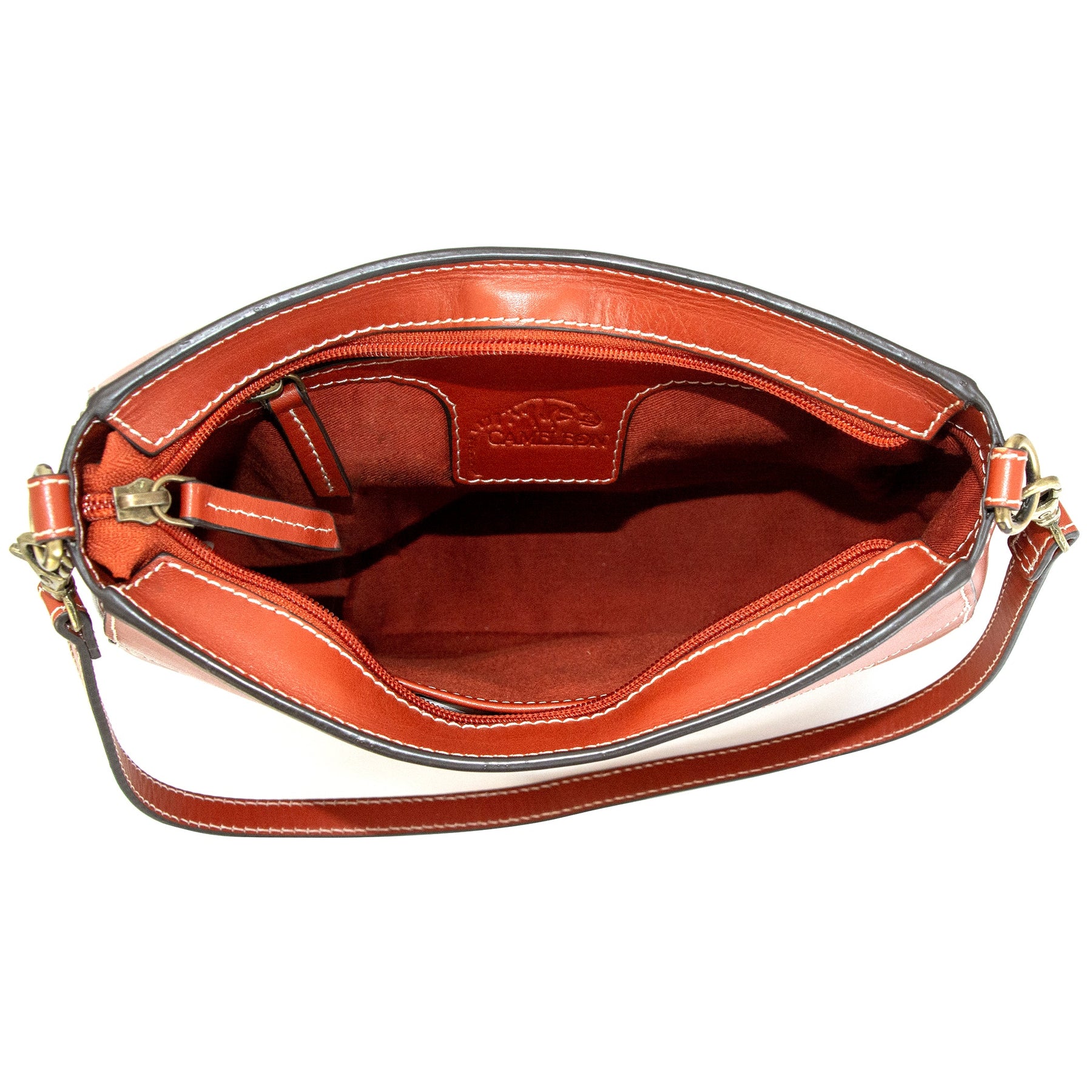 This iconic Saddle bag design has been reinvented to give you a stylish while still comfortable bag while carrying a concealed weapon. The bag’s main compartment is a spacious deep pocket with one top zipper. Our Saddle may be carried over the shoulder or by hand, if needed it can be switched to a crossbody bag with a detachable strap. This Saddle features cinnamon, blue, and tan genuine leather finish with antique gold-finish metal hardware.