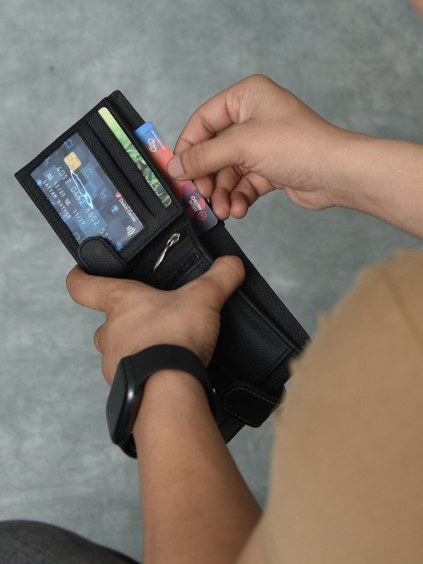 Crafted from genuine buffalo leather, this Salvatore men's leather wallet is a smart and compact way to hold your cash and cards securely. The leather wallet comes in an easy-to-slip pocket with tab closure functionality, boasts a flip-out design, and includes multiple card slots, two cash pockets, and a separate coin section to store loose change.