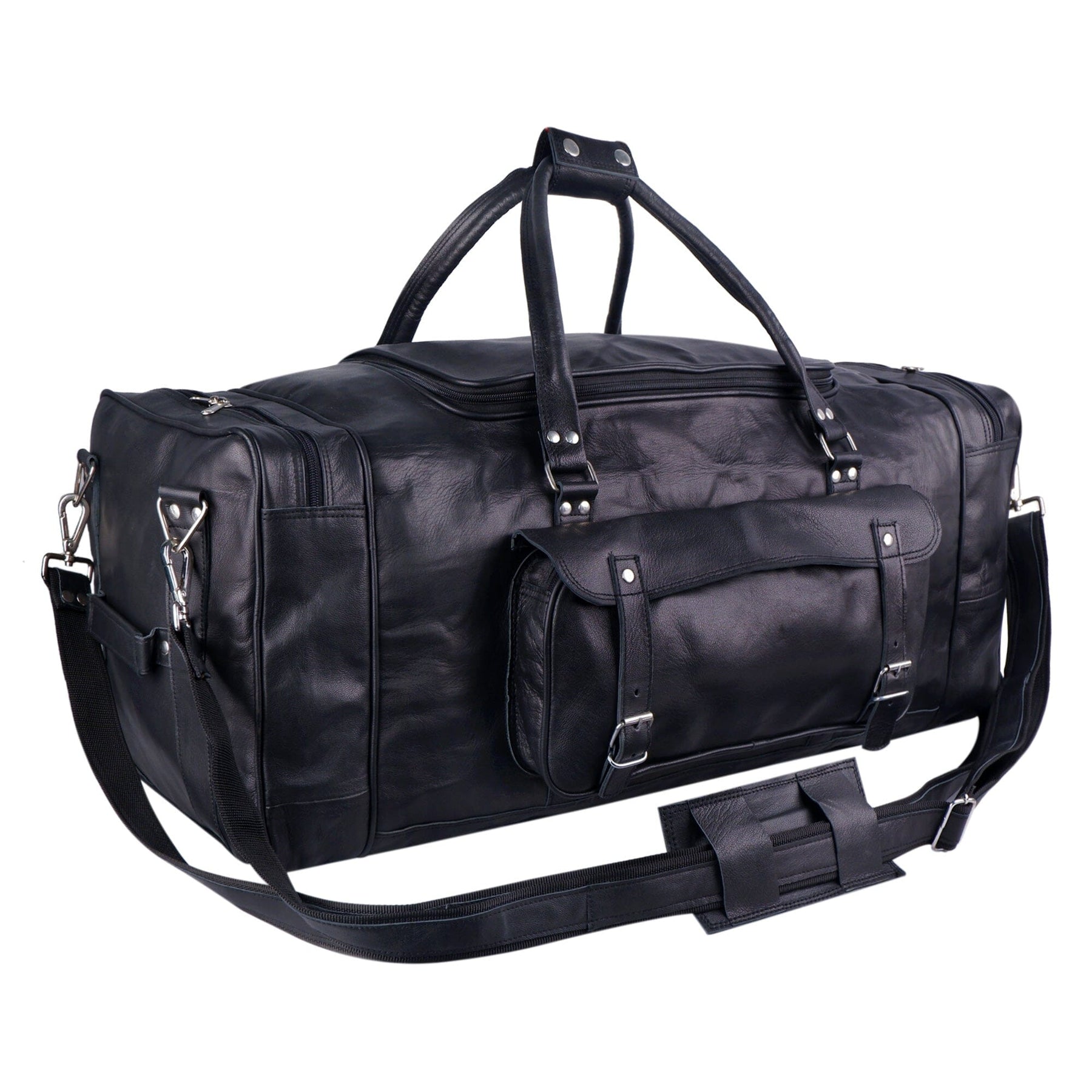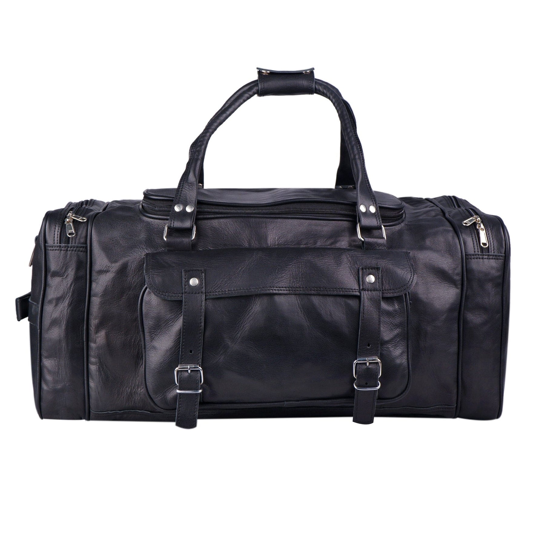Crafted from the finest quality full-grain leather, this weekender duffel bag is a must-have for your travels. The black color with rustic silver hardware gives it a classy and eye-catching look. This leather bag is spacious enough with four compartments: one big compartment for all your clothes and shoes, two small side compartments with a zipper for all of your accessories, and one front pocket with buckles. This is a multipurpose bag and can be used as a gym bag, overnight bag, weekender bag, travel bag for small trips, etc.