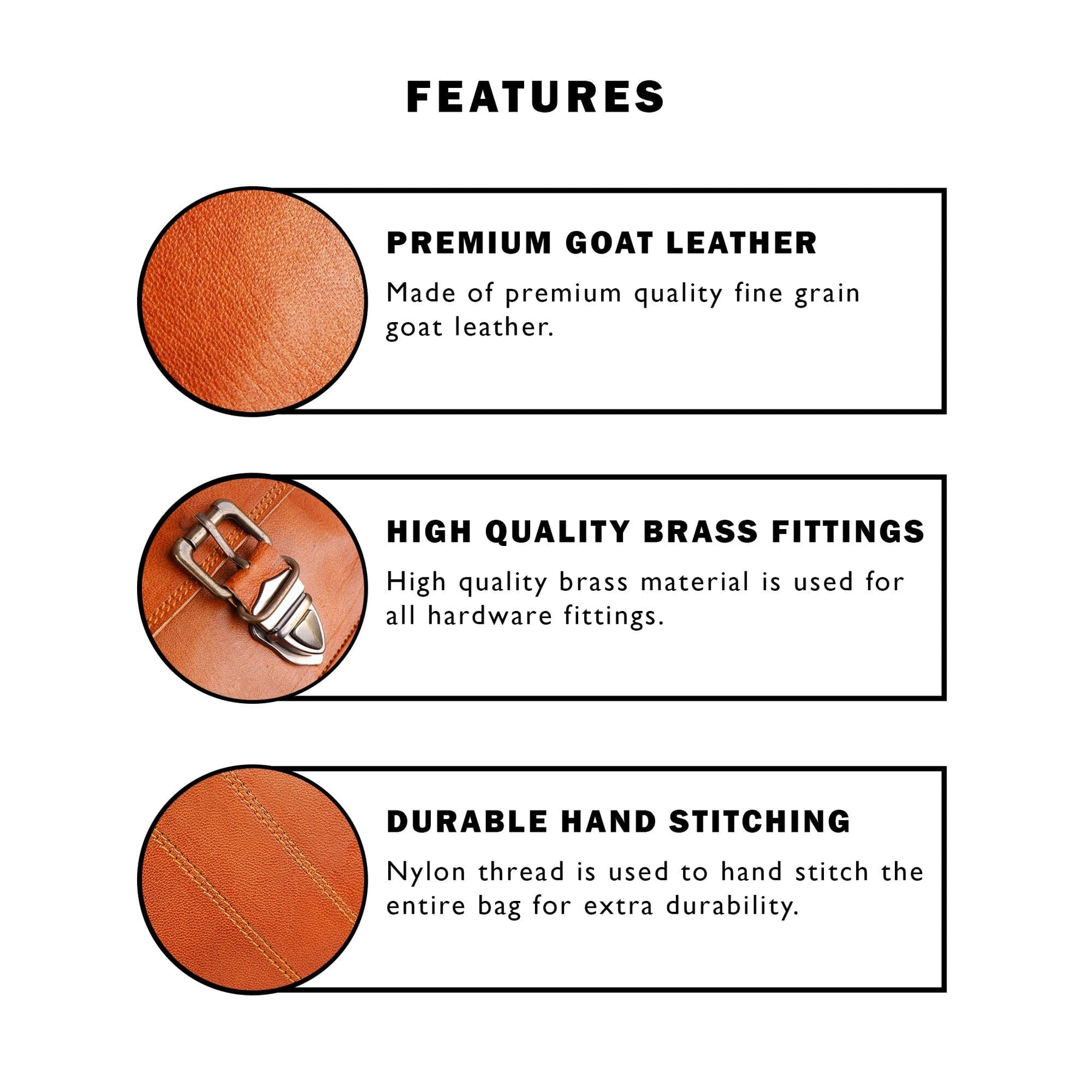 This uber-stylish bag is made from the finest quality goat leather and embellished with running stitches. We offer excellent craftsmanship to ensure uniqueness and exclusivity. We are glad to let you know that all the procedures followed for tanning the skin are natural. Thus, it’s environment-friendly and devoid of harmful chemicals. The vintage-looking, semi-glossy surface of the messenger bag is water- and scratch-resistant. It is underlined by a high-quality canvas, thus giving it a neat internal finish.