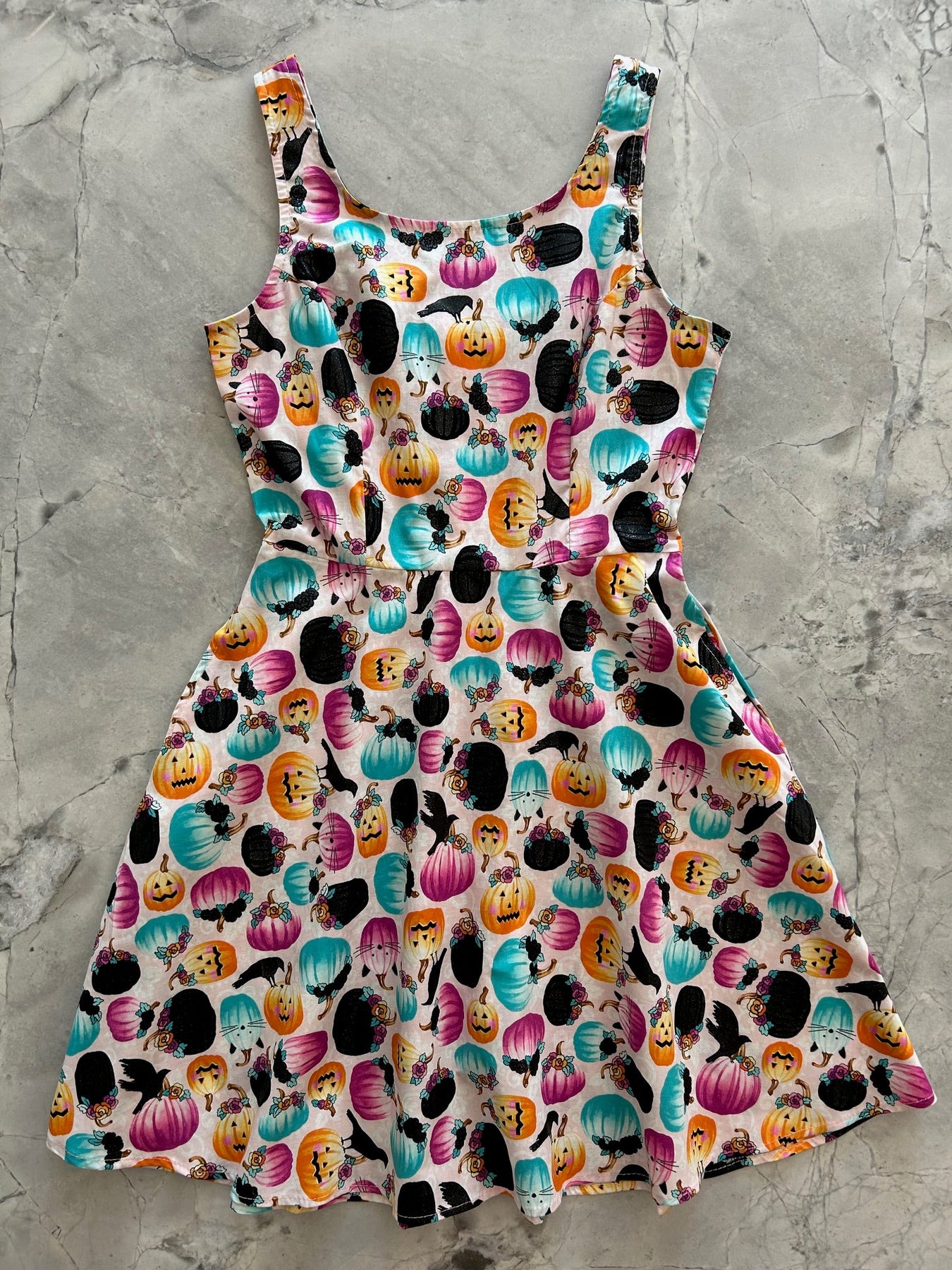 Fun, flirty, and totally retro: our skater dress is the perfect addition to your closet!  Shown in our Pumpkin & Crow print, this vintage inspired dress features a scoop front and back, elasticized waist in the back for ease of wear, a flirty a-line skirt with hidden side pockets, and a back zippered closure.