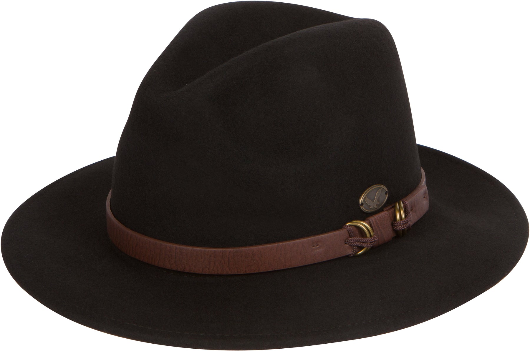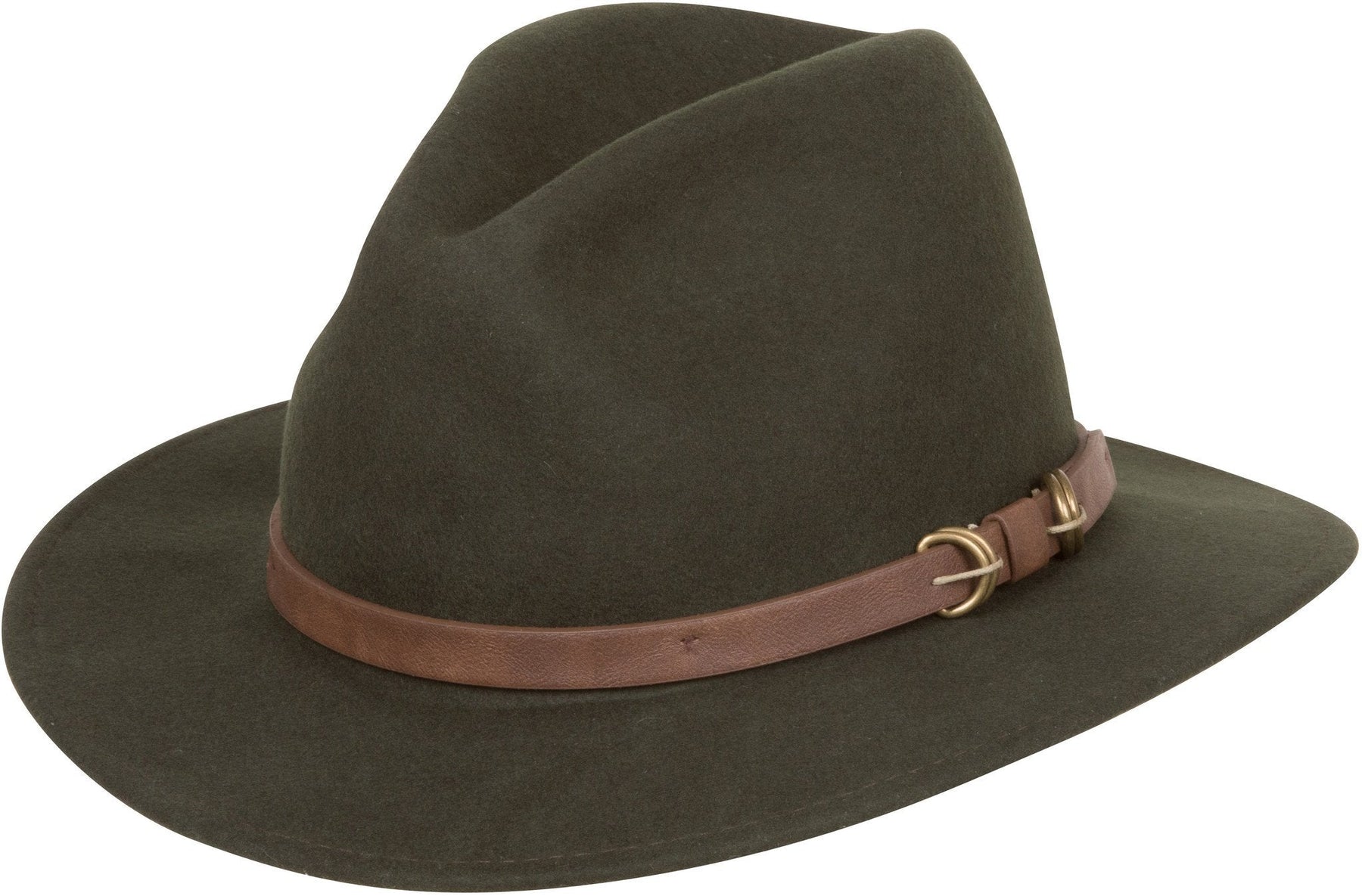 Modern western style fedora hat features soft felt wool construction, pinch crown, burnished metallic accents, faux leather band and sweatband.
