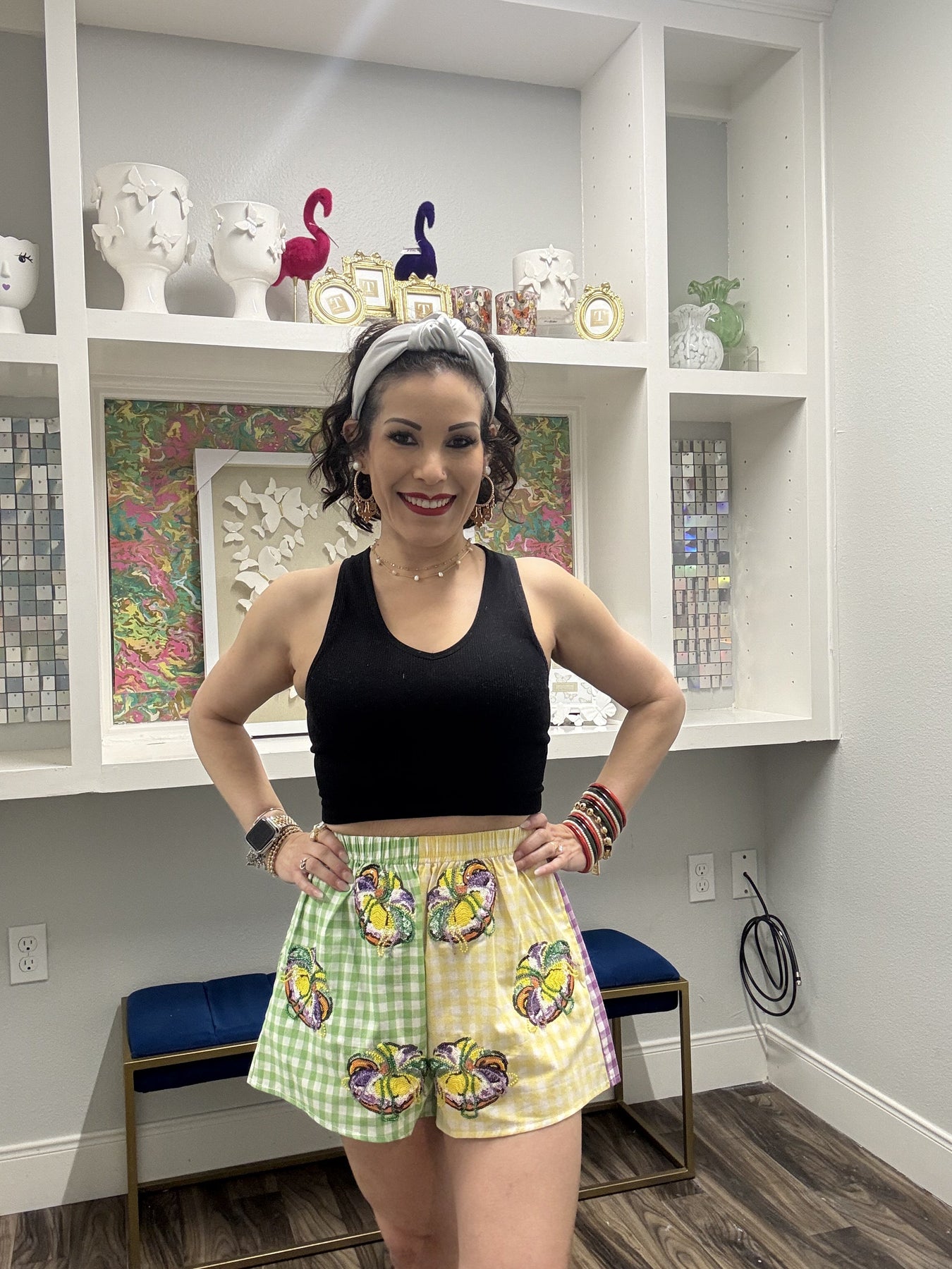 Celebrate the season in style with this vibrant Colorblock Mardi Gras Gingham King Cake Short! Featuring a festive mix of bold, jewel-toned colorblocking paired with classic gingham patterns, this playful piece captures all the fun and flair of Mardi Gras. The comfortable short silhouette is perfect for parades, parties, or everyday celebrations. Whether you're catching beads or just spreading joy, this eye-catching design brings the party wherever you go. Get ready to turn heads and embrace your inner queen of sparkles! Model is wearing an XS