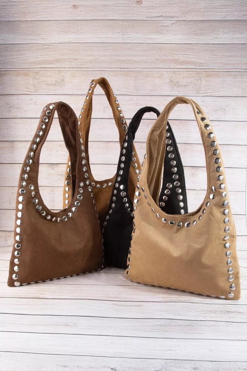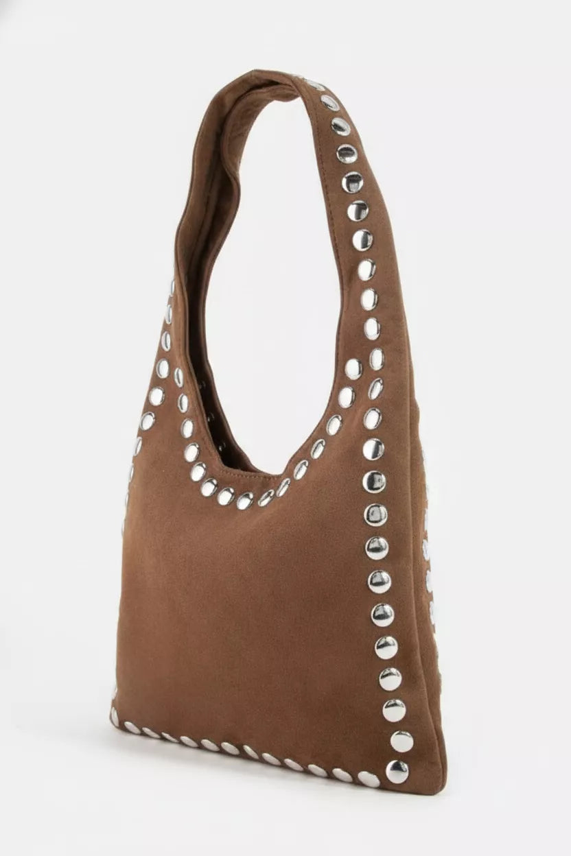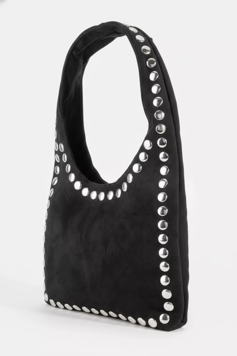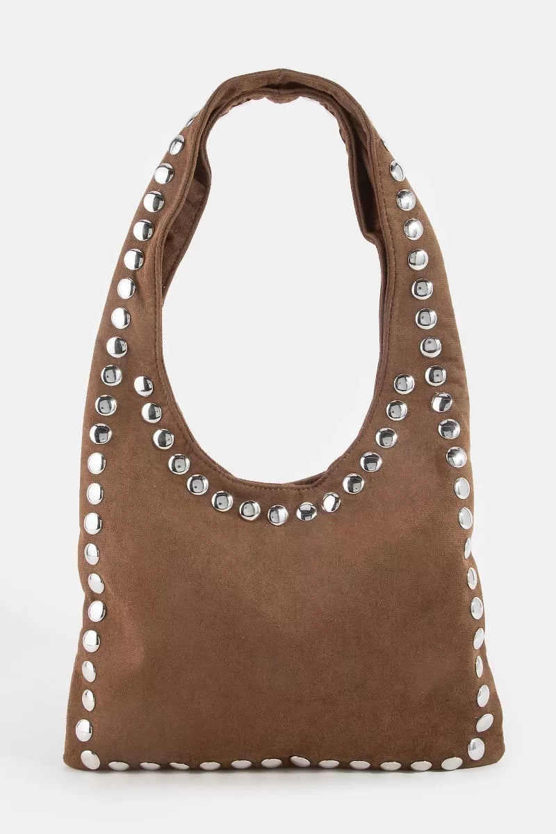 The Grommet Border Studded Suede Shoulder Bag is a chic and edgy accessory to elevate your outfit. With grommet border detailing and studded accents, this shoulder bag adds a touch of rock-inspired style. Crafted from suede, it exudes a luxurious and textured appeal. The shoulder bag design offers practicality and style, making it a versatile piece for day or night looks. Make a statement and stand out from the crowd with this trendy and fashionable shoulder bag that blends sophistication with an edge.