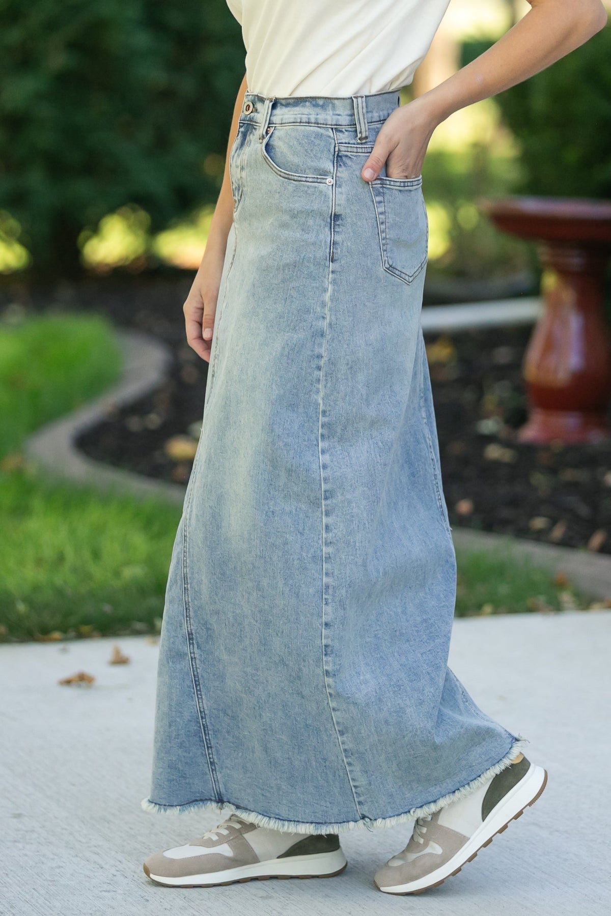 This maxi skirt is full of lovely details! A beautiful light wash, modest length and that incredible a-line fit! The Piper A-Line Long Denim Maxi Skirt is a maxi designed off of our Riley skirt! Incredible comfortable and perfect for anyone wanting that timeless look! You will especially love the light fringe on the hem and leather patch detail, with no slit in the back!