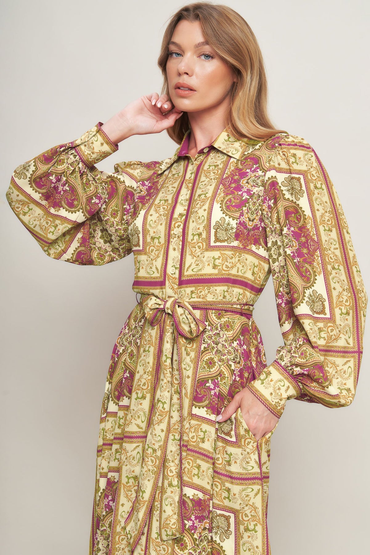 A printed woven maxi dress featuring collar, long sleeve with cuff, front button down, self sash tie and ruffled hemline