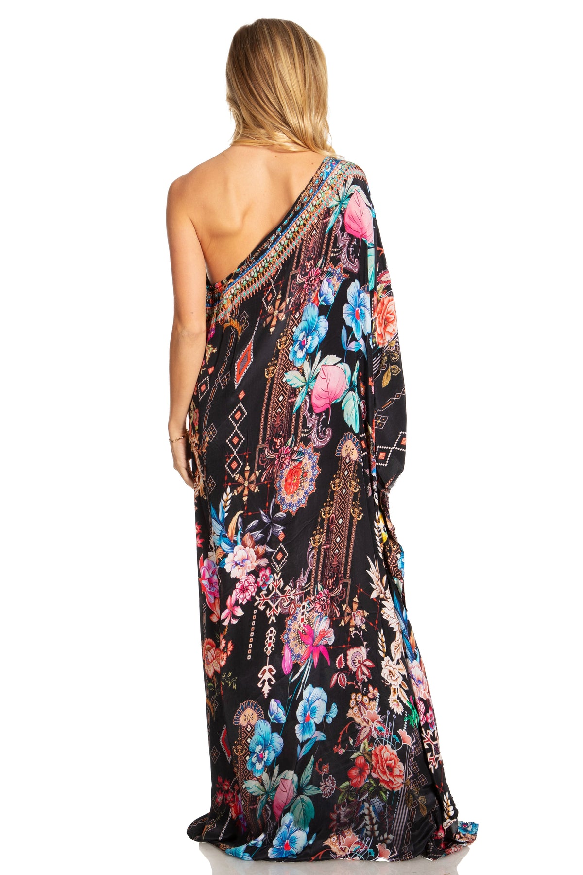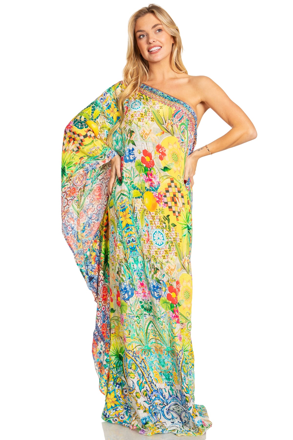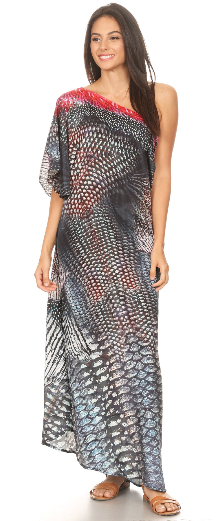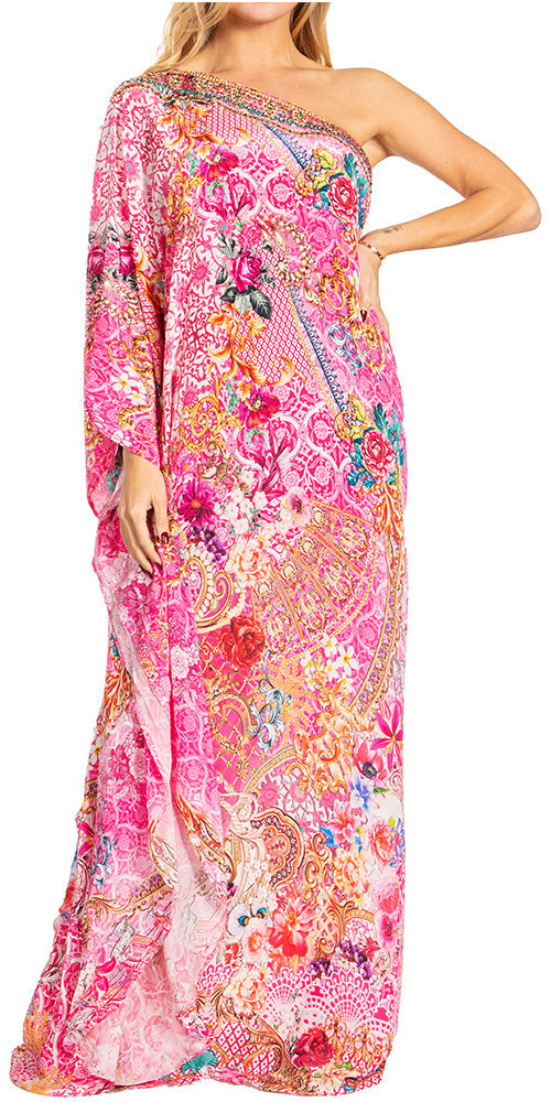 • MAXI/COVER-UP/SUNDRESS/CAFTAN DRESS: Dora, the perfect lightweight casual everyday dress. This lovely garment features a one shoulder short sleeve upper, wide neck opening, colorful print, embellishment at front, A-line shape. Ideal for everyday wear, easily transitions from casual to formal, can also be worn as swimwear cover up! Look and feel like a goddess in any setting while wearing this gorgeous dress!