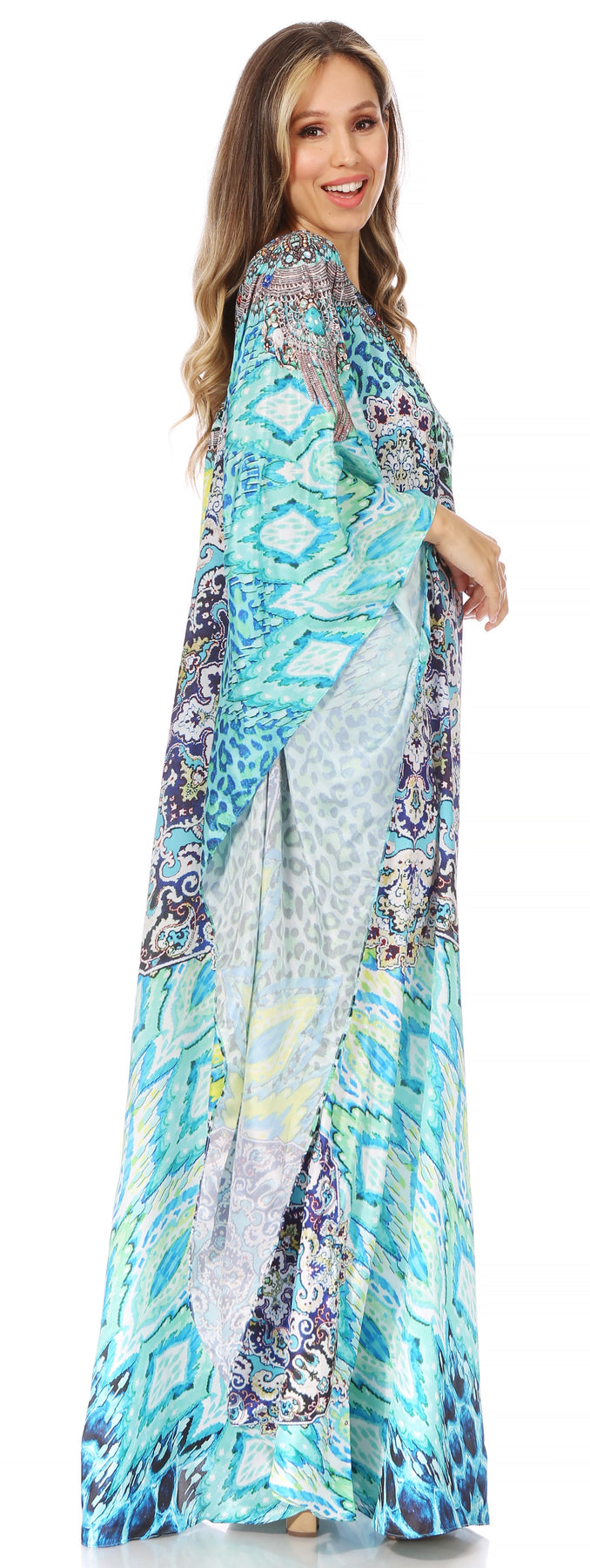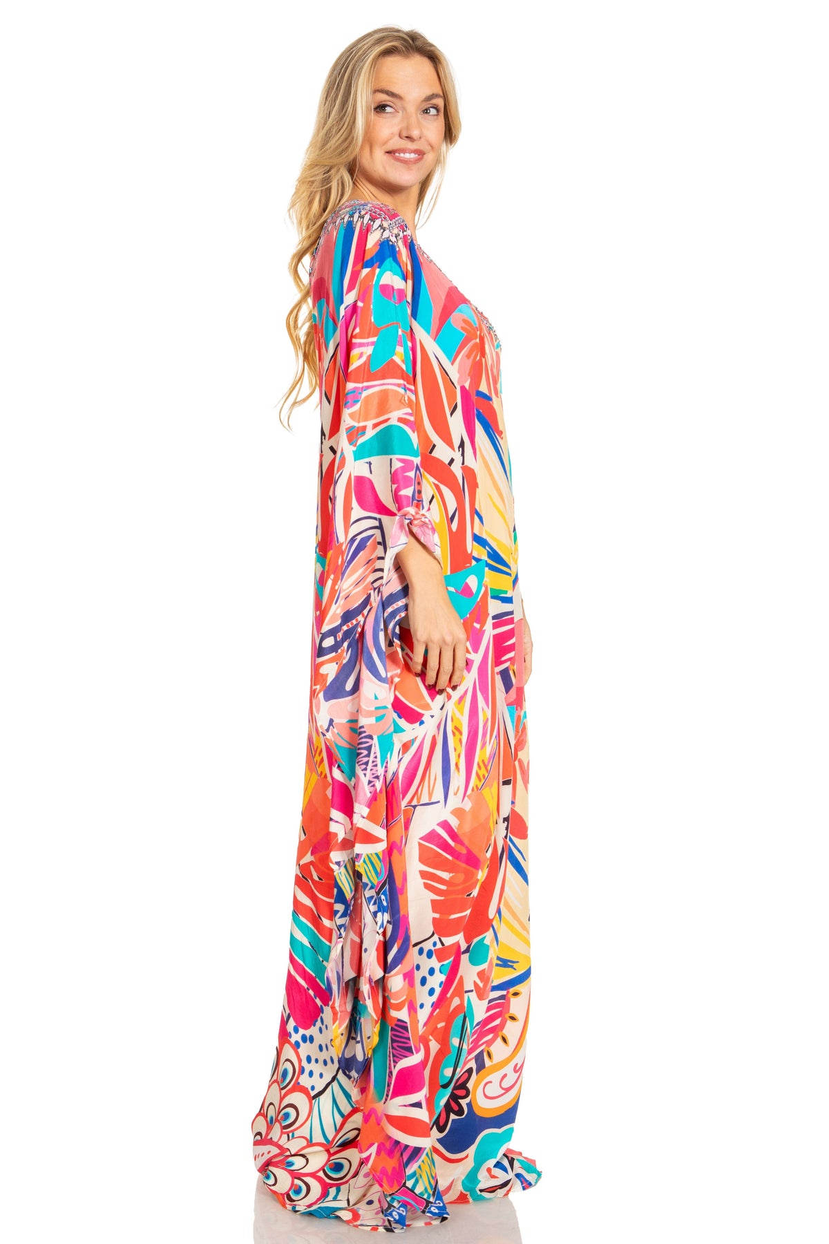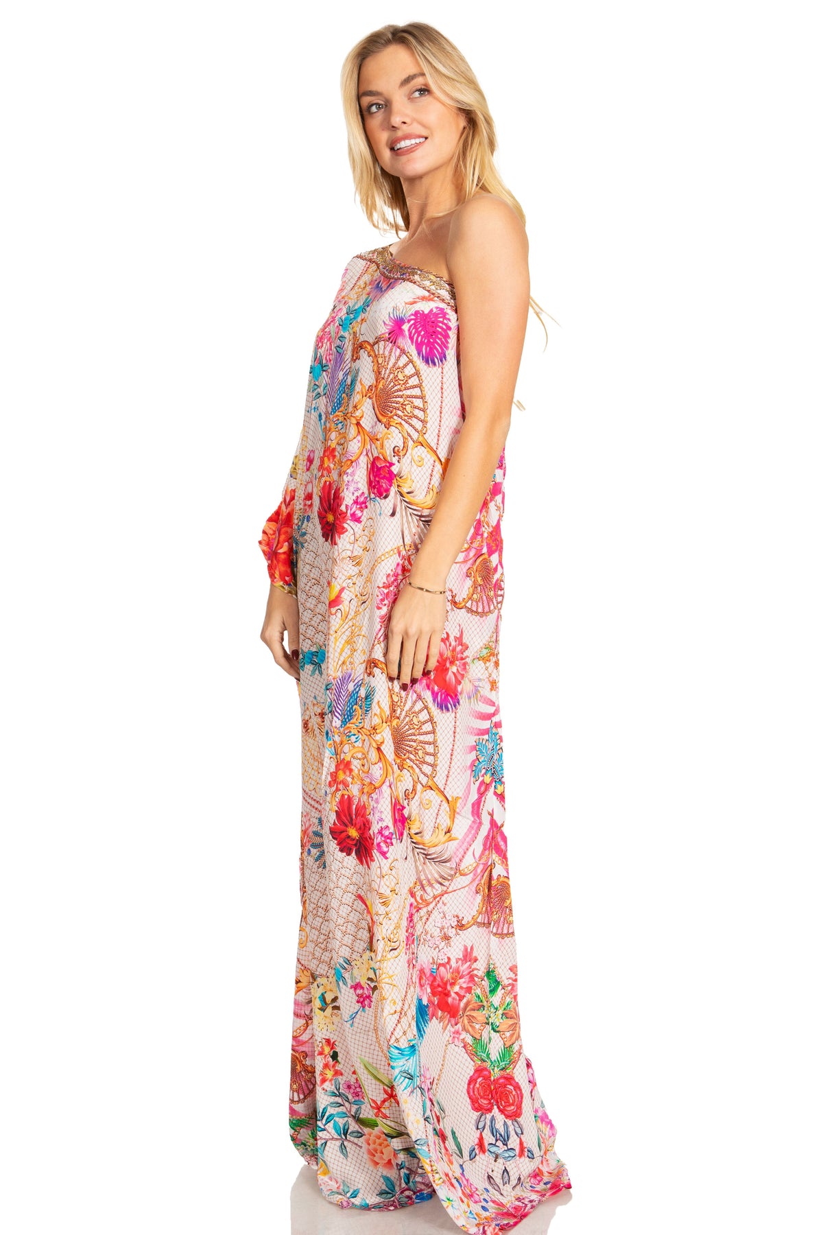 • MAXI/COVER-UP/SUNDRESS/CAFTAN DRESS: Dora, the perfect lightweight casual everyday dress. This lovely garment features a one shoulder short sleeve upper, wide neck opening, colorful print, embellishment at front, A-line shape. Ideal for everyday wear, easily transitions from casual to formal, can also be worn as swimwear cover up! Look and feel like a goddess in any setting while wearing this gorgeous dress!