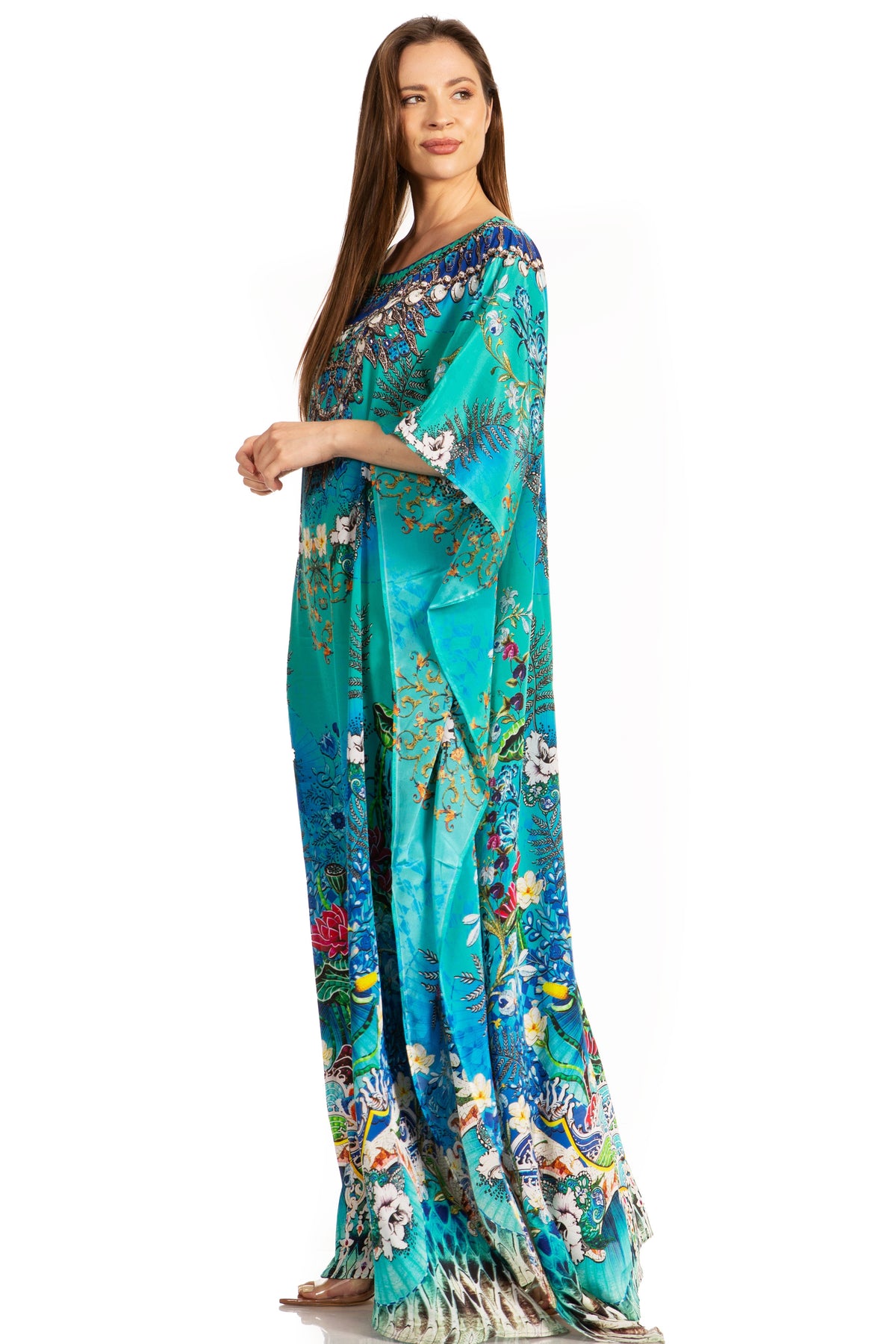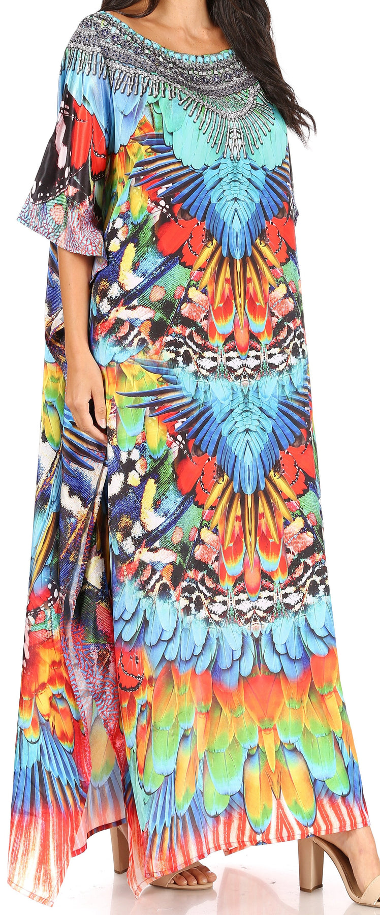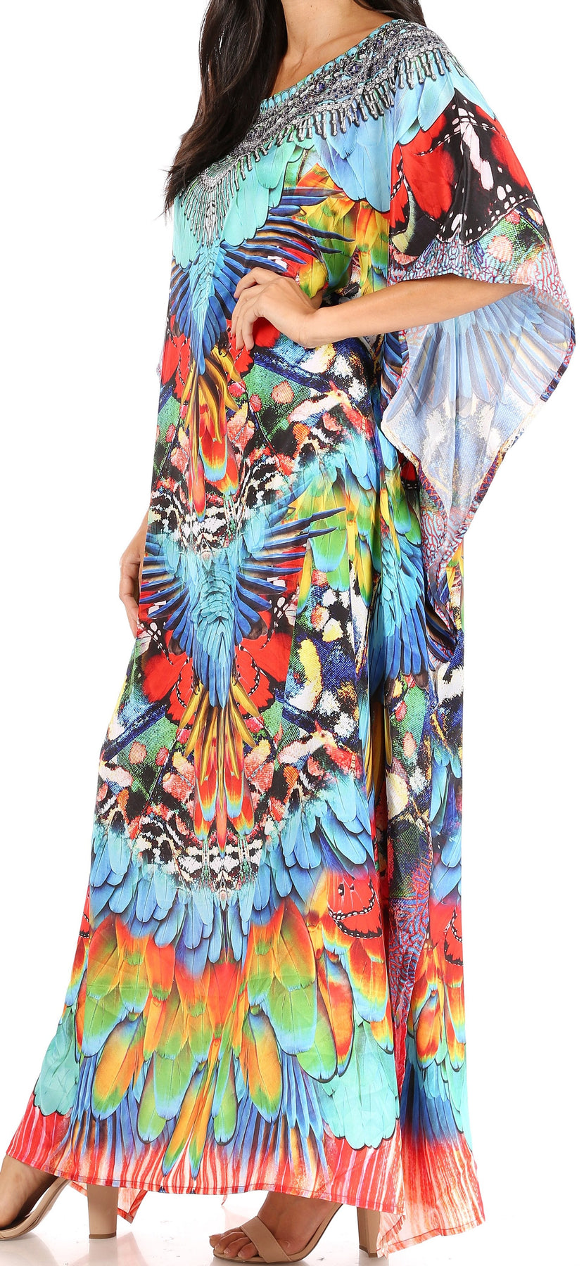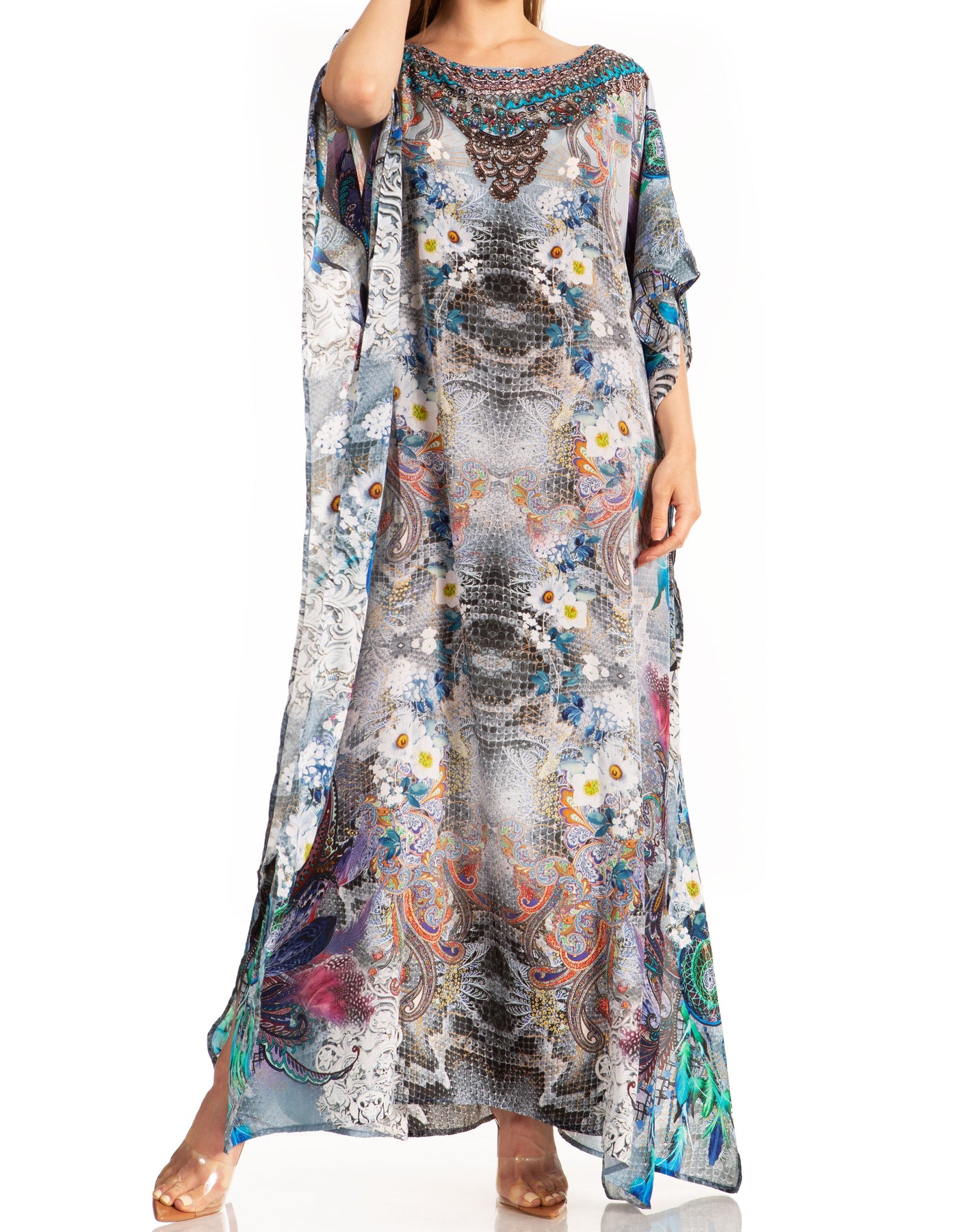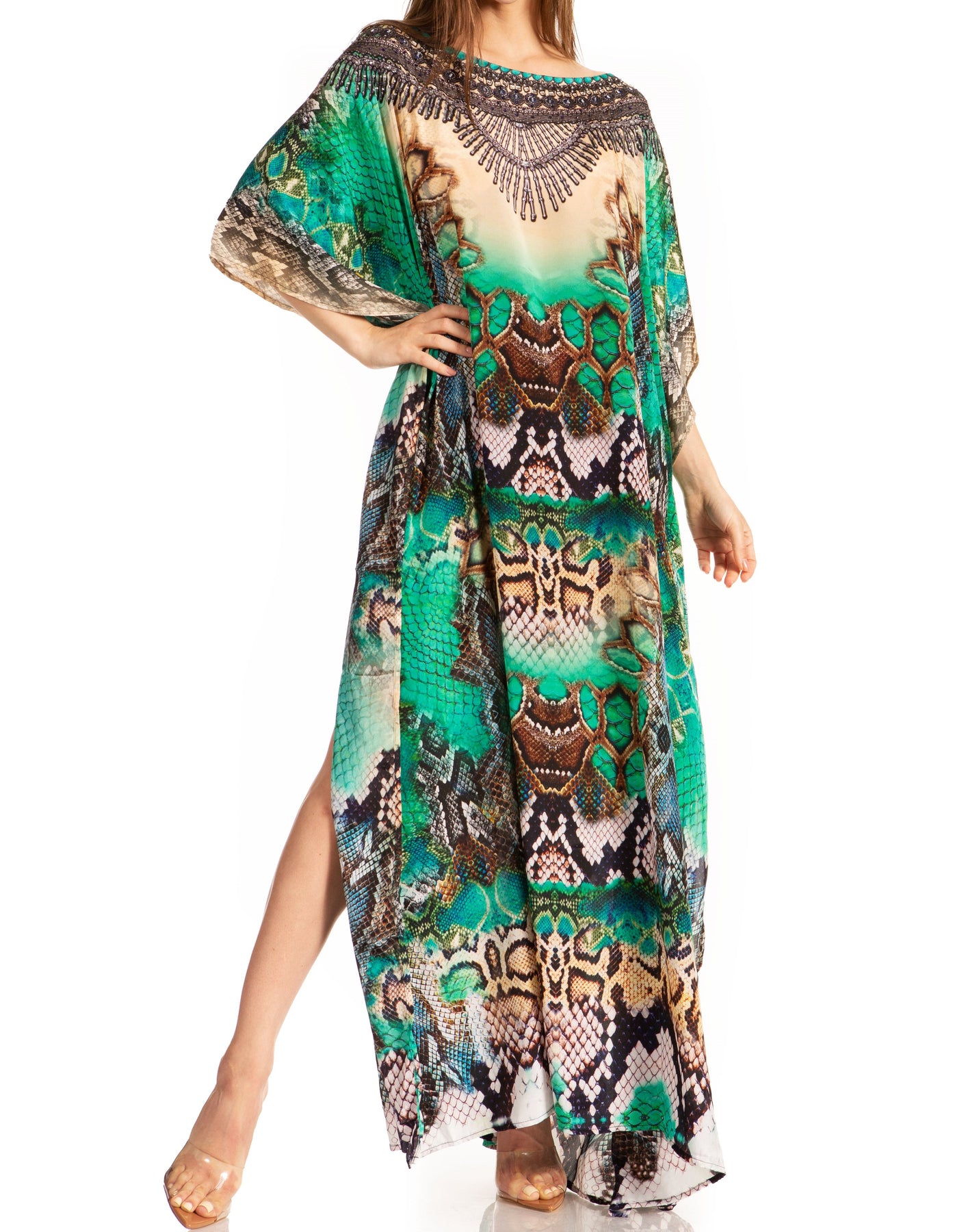 • This lovely kaftan dress features a boat-neck and generous sleeve openings. Also, nicely placed rhinestones around the neckline. This garment is perfect for all body shapes, made with lightweight soft opaque crepe fabric and colorful print.