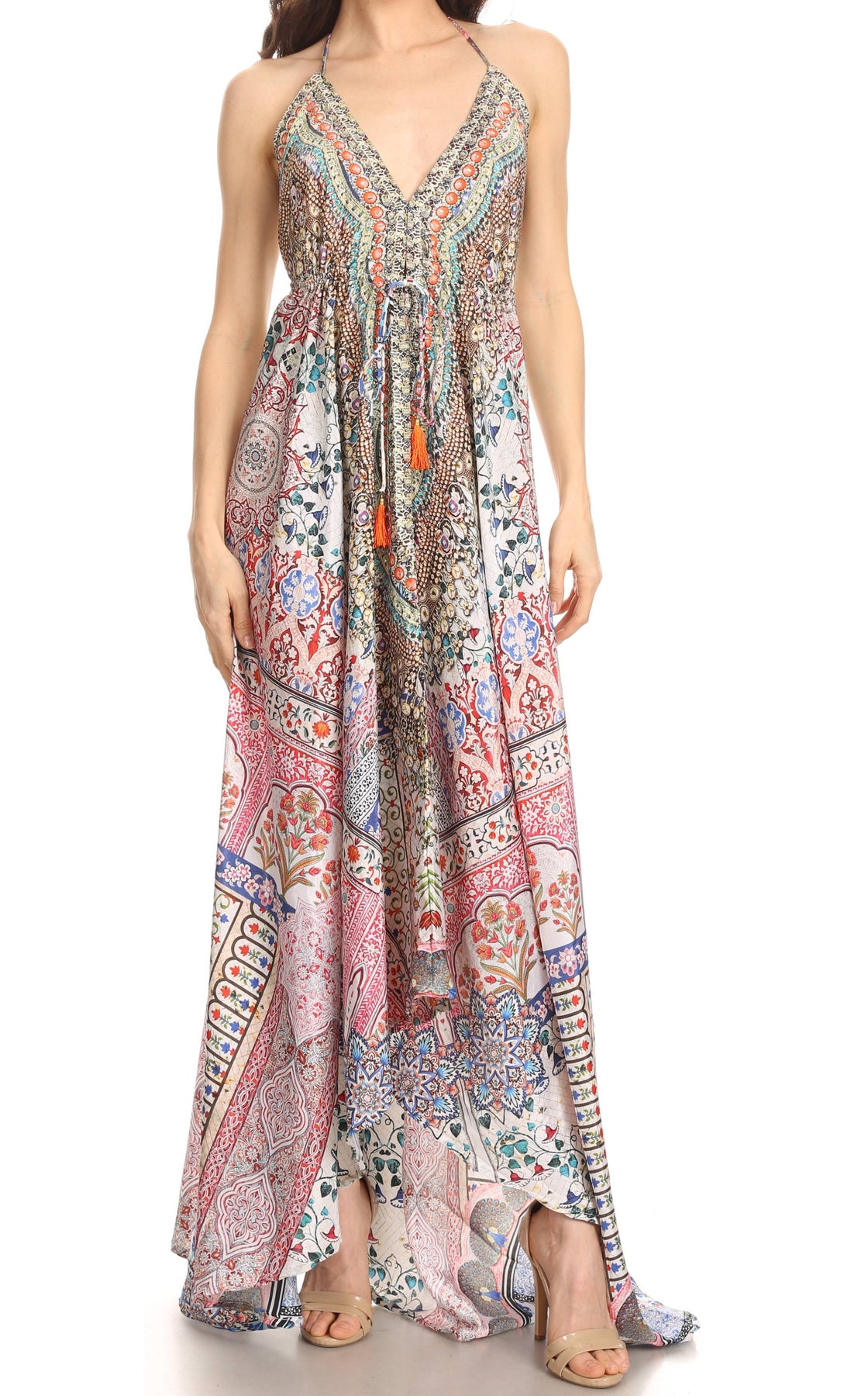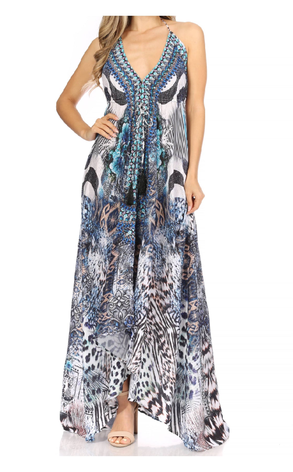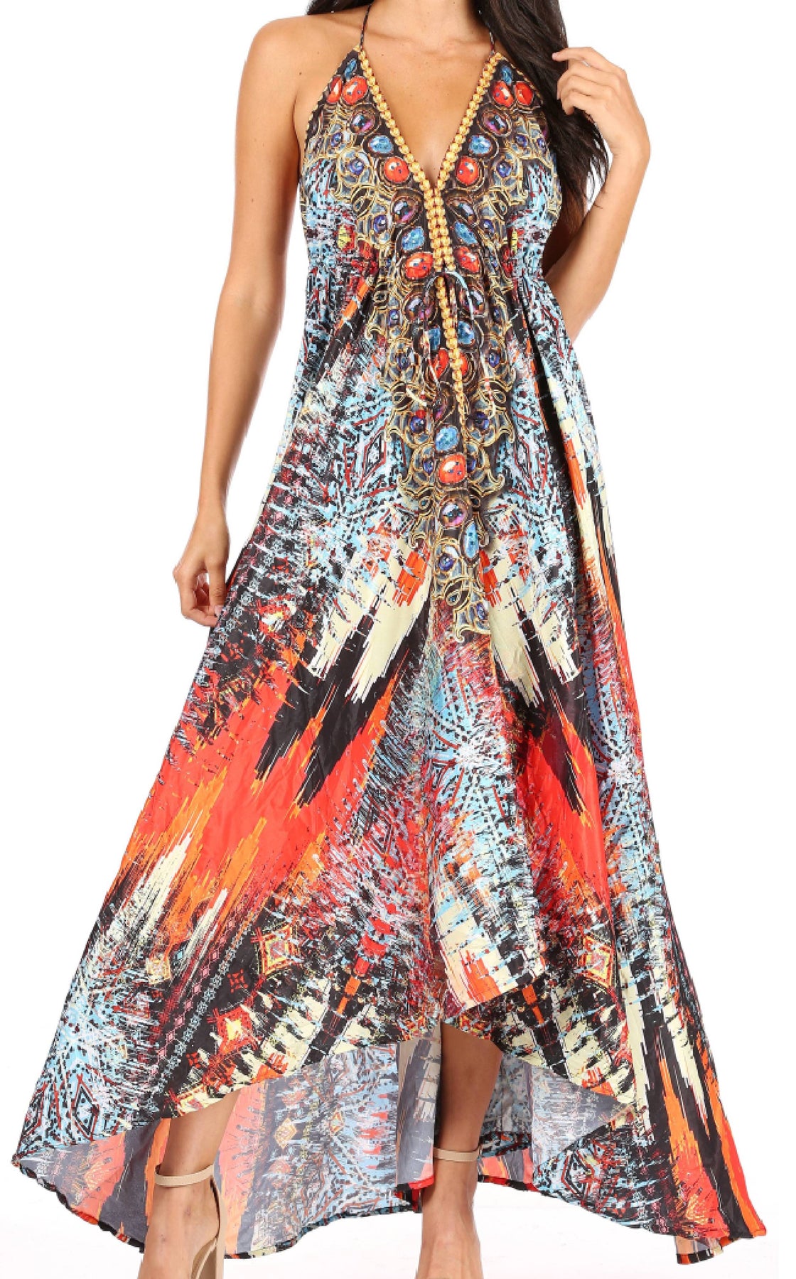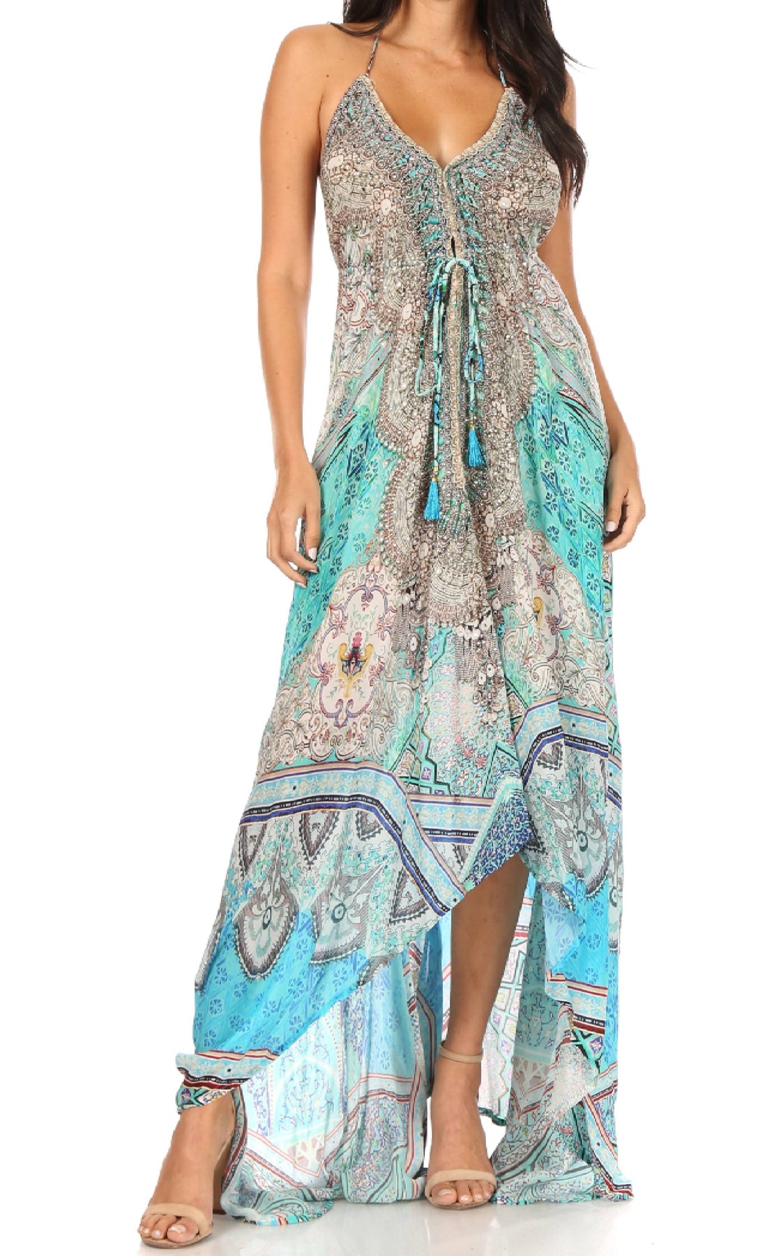 • Striking and dazzling maxi halter dress with embellishment and precious rock like tassels. Silky texture and light as a feather. This lovely dress features a built-in waist and shoulder tie, perfect to accommodate it to your body type. It also features a handkerchief hem and lots of volumes. Ideal for casual wear, brunch, going out, events, weddings and traveling. Feel like a goddess on this flowy and very feminine dress!