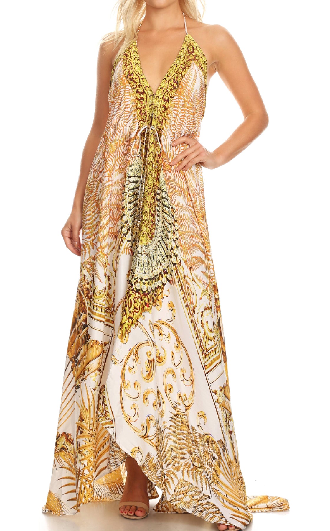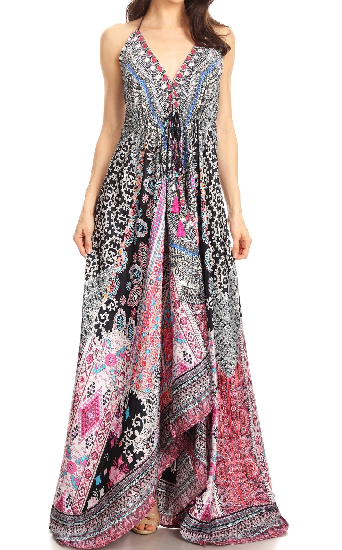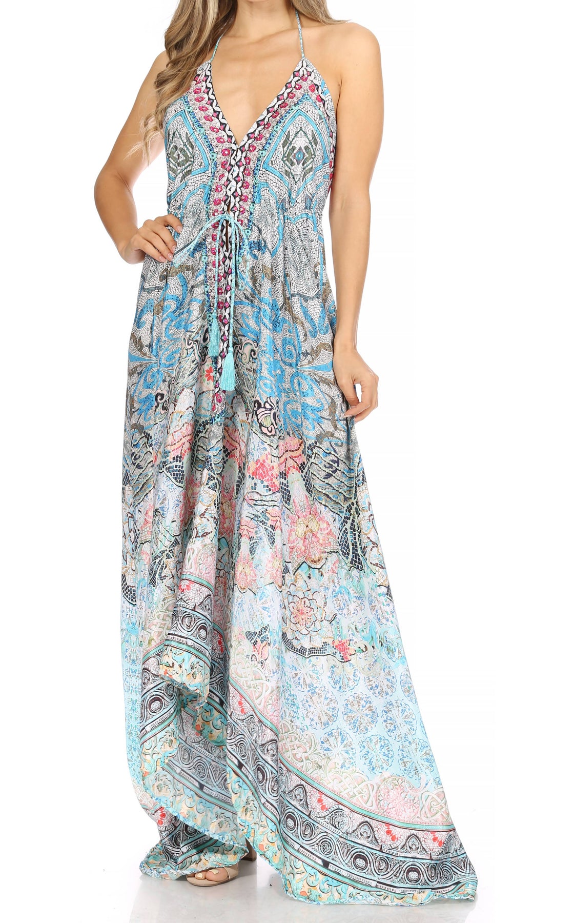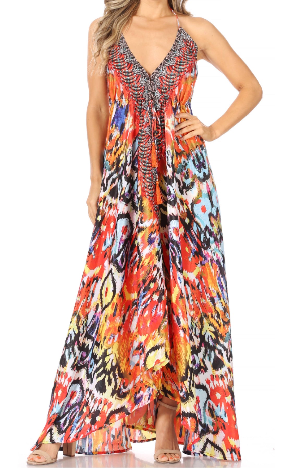 • Striking and dazzling maxi halter dress with embellishment and precious rock like tassels. Silky texture and light as a feather. This lovely dress features a built-in waist and shoulder tie, perfect to accommodate it to your body type. It also features a handkerchief hem and lots of volumes. Ideal for casual wear, brunch, going out, events, weddings and traveling. Feel like a goddess on this flowy and very feminine dress!