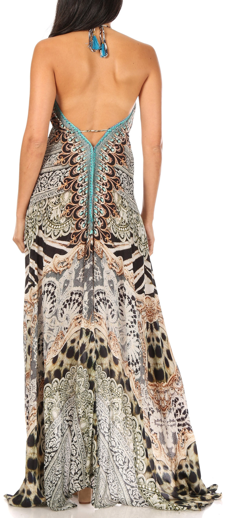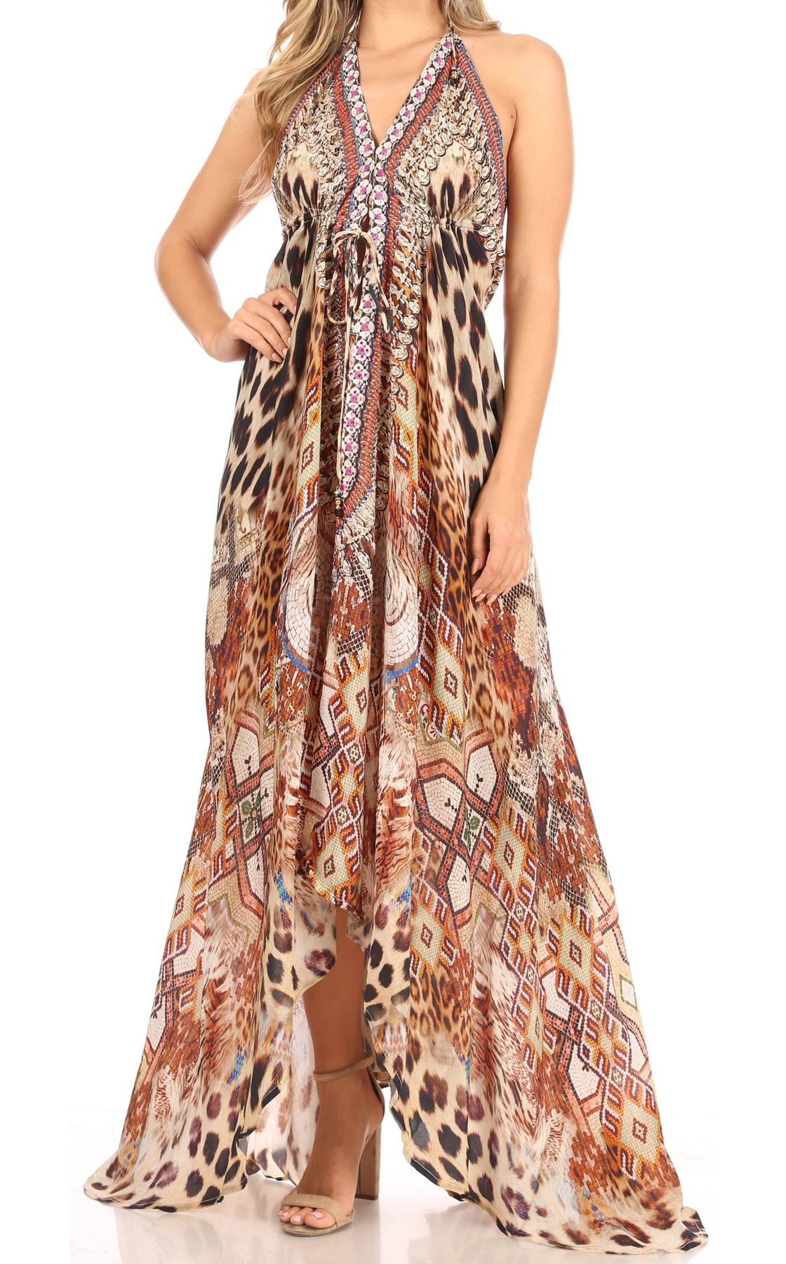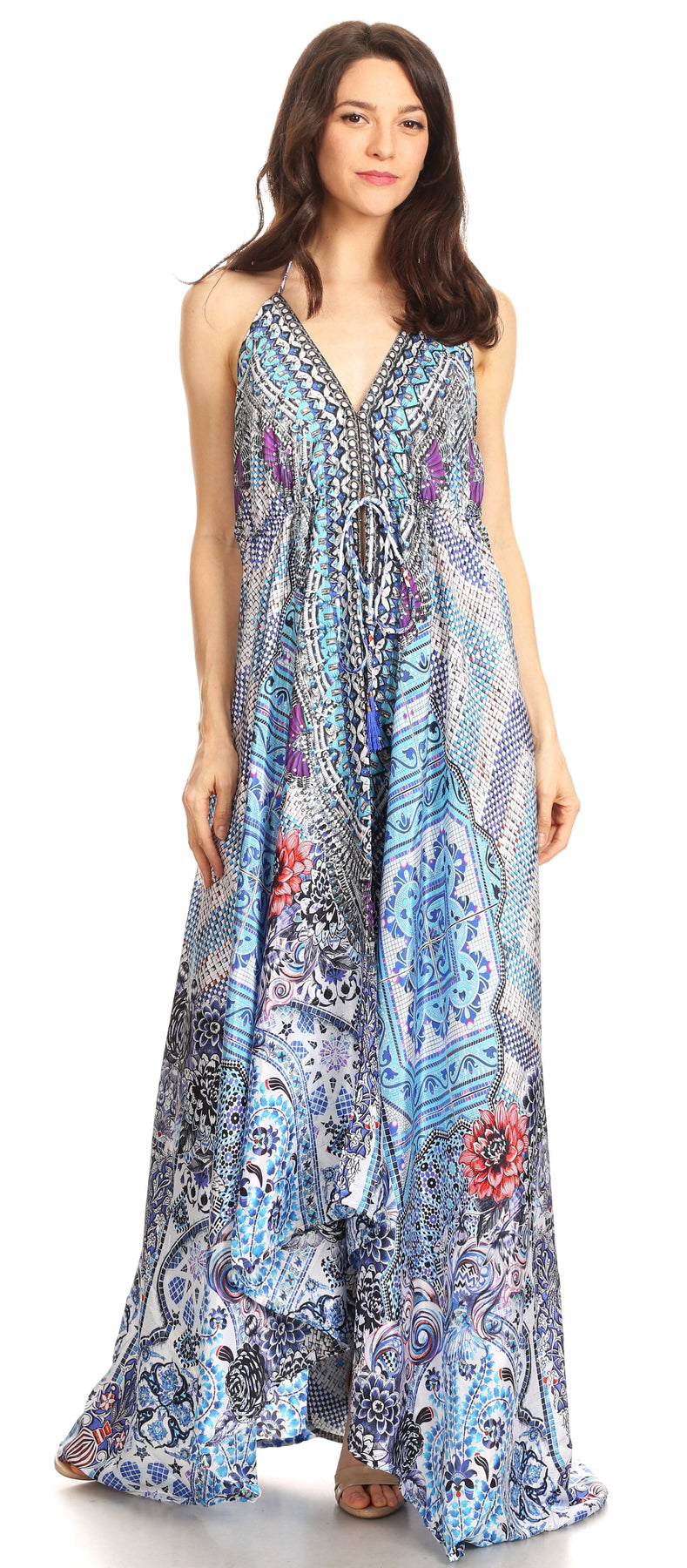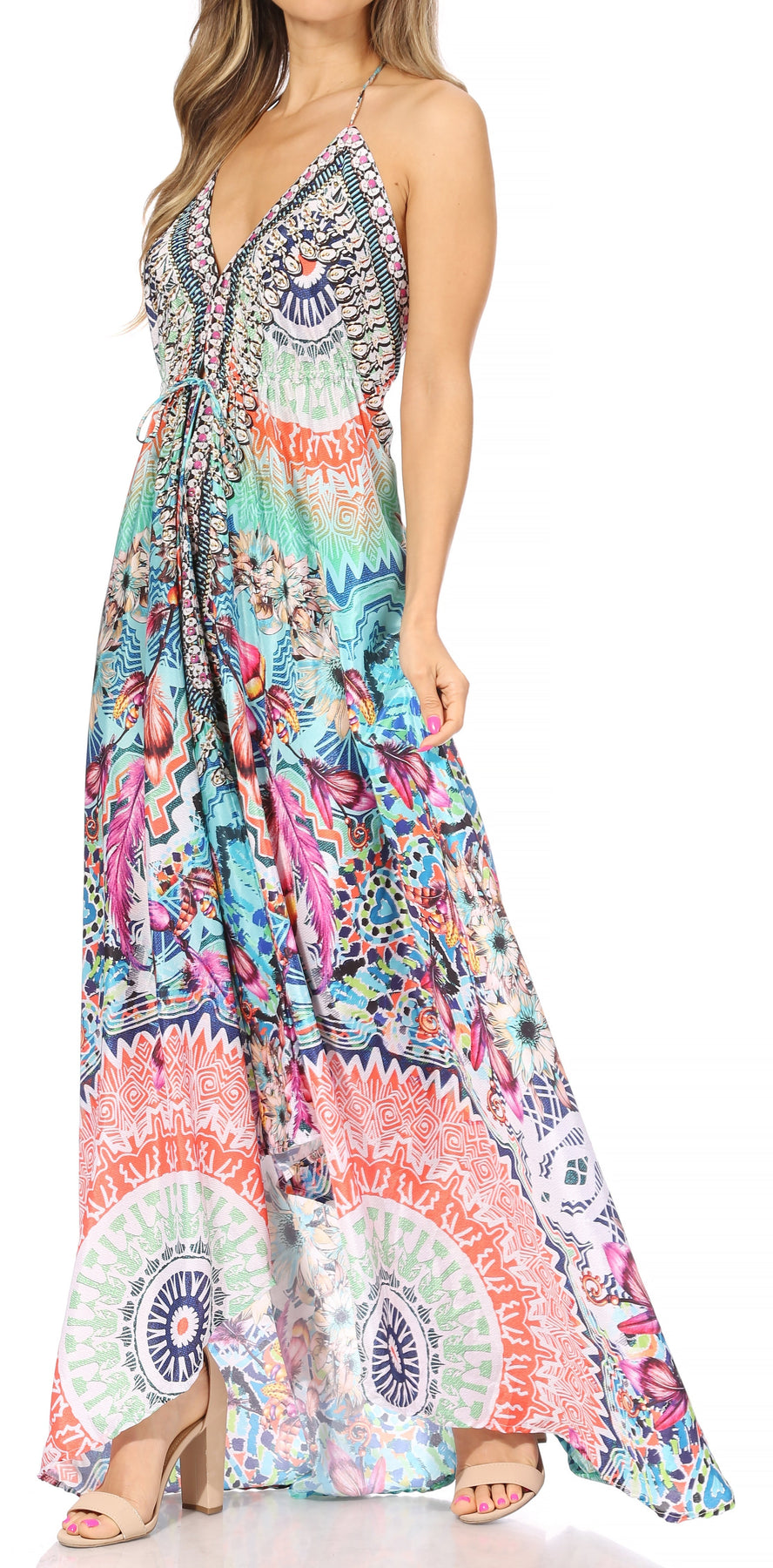 • Striking and dazzling maxi halter dress with embellishment and precious rock like tassels. Silky texture and light as a feather. This lovely dress features a built-in waist and shoulder tie, perfect to accommodate it to your body type. It also features a handkerchief hem and lots of volumes. Ideal for casual wear, brunch, going out, events, weddings and traveling. Feel like a goddess on this flowy and very feminine dress!