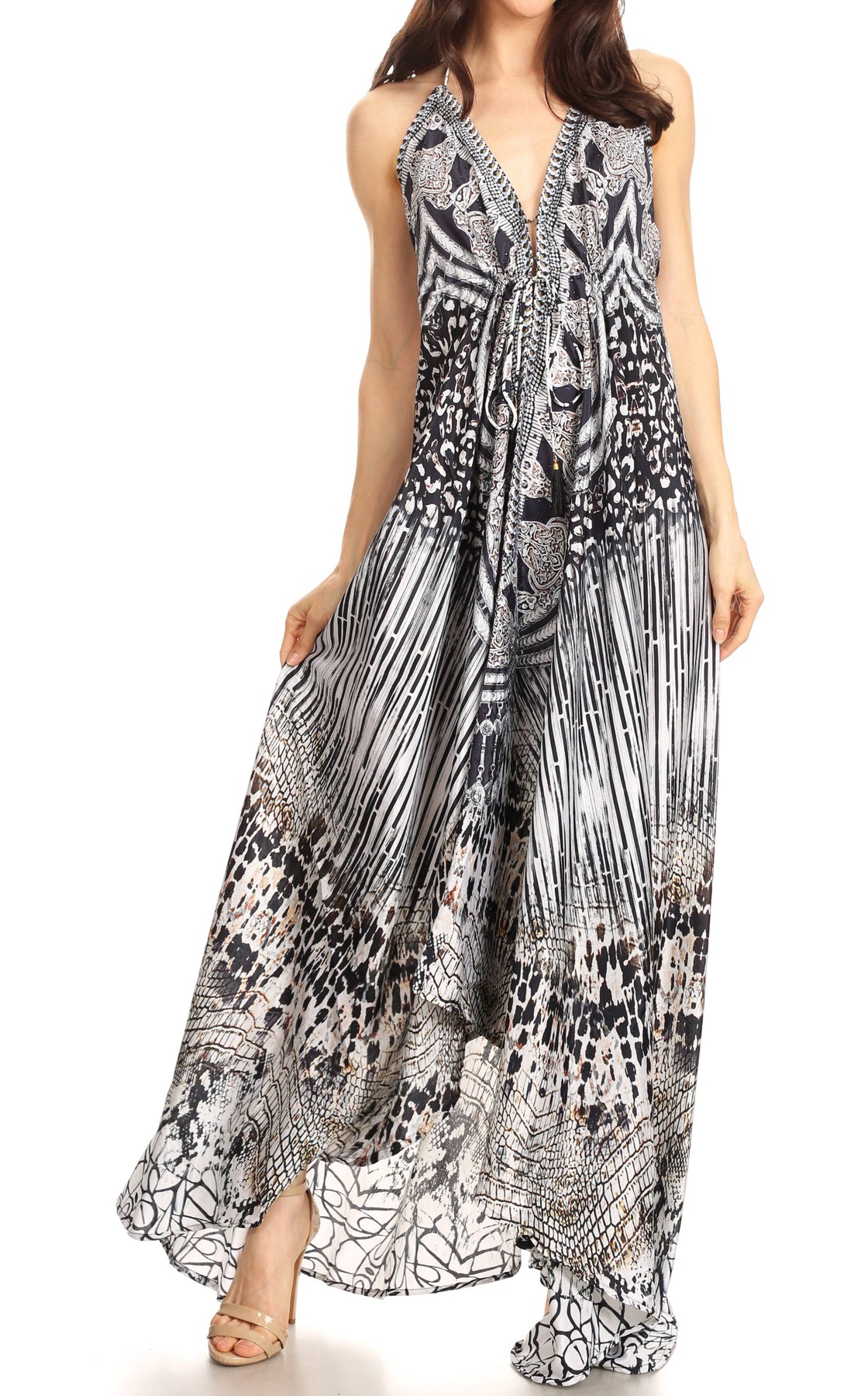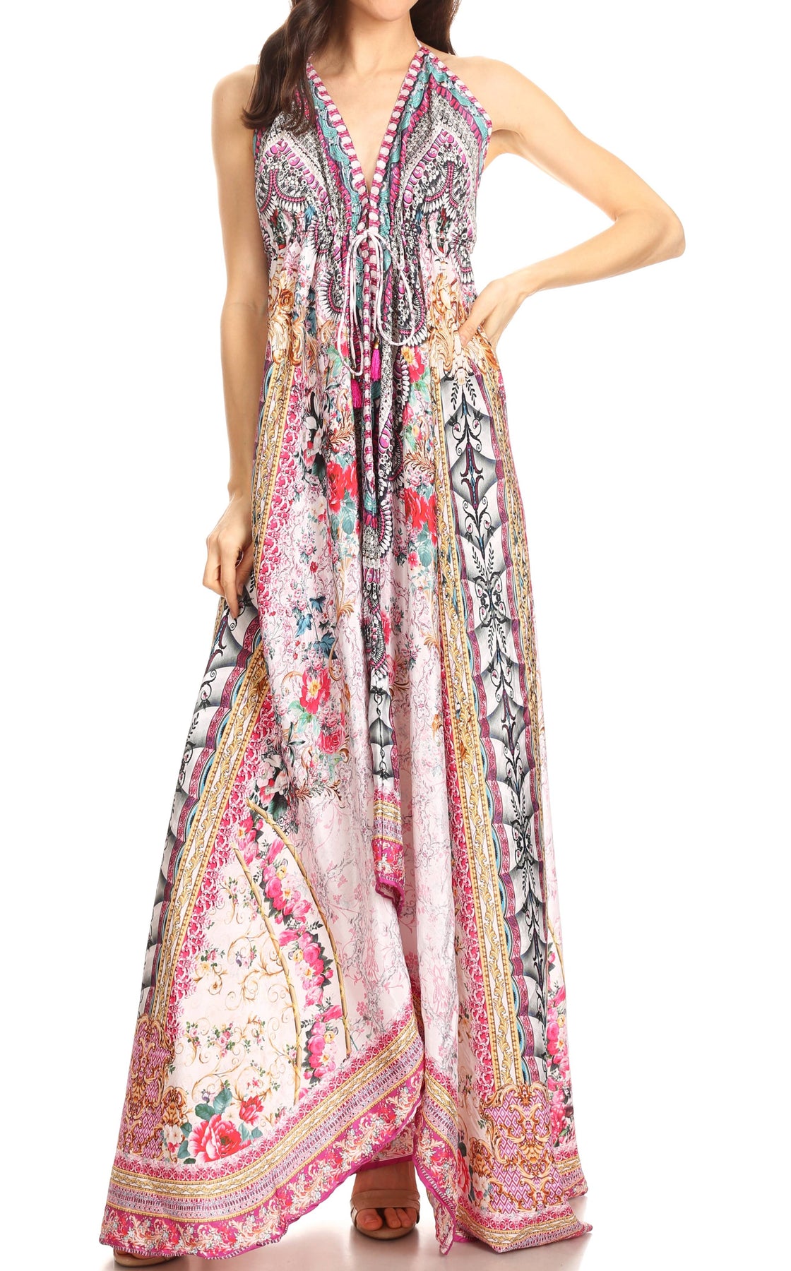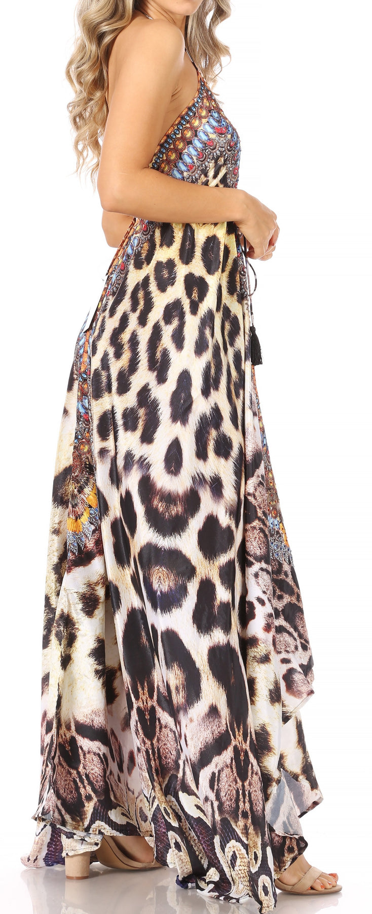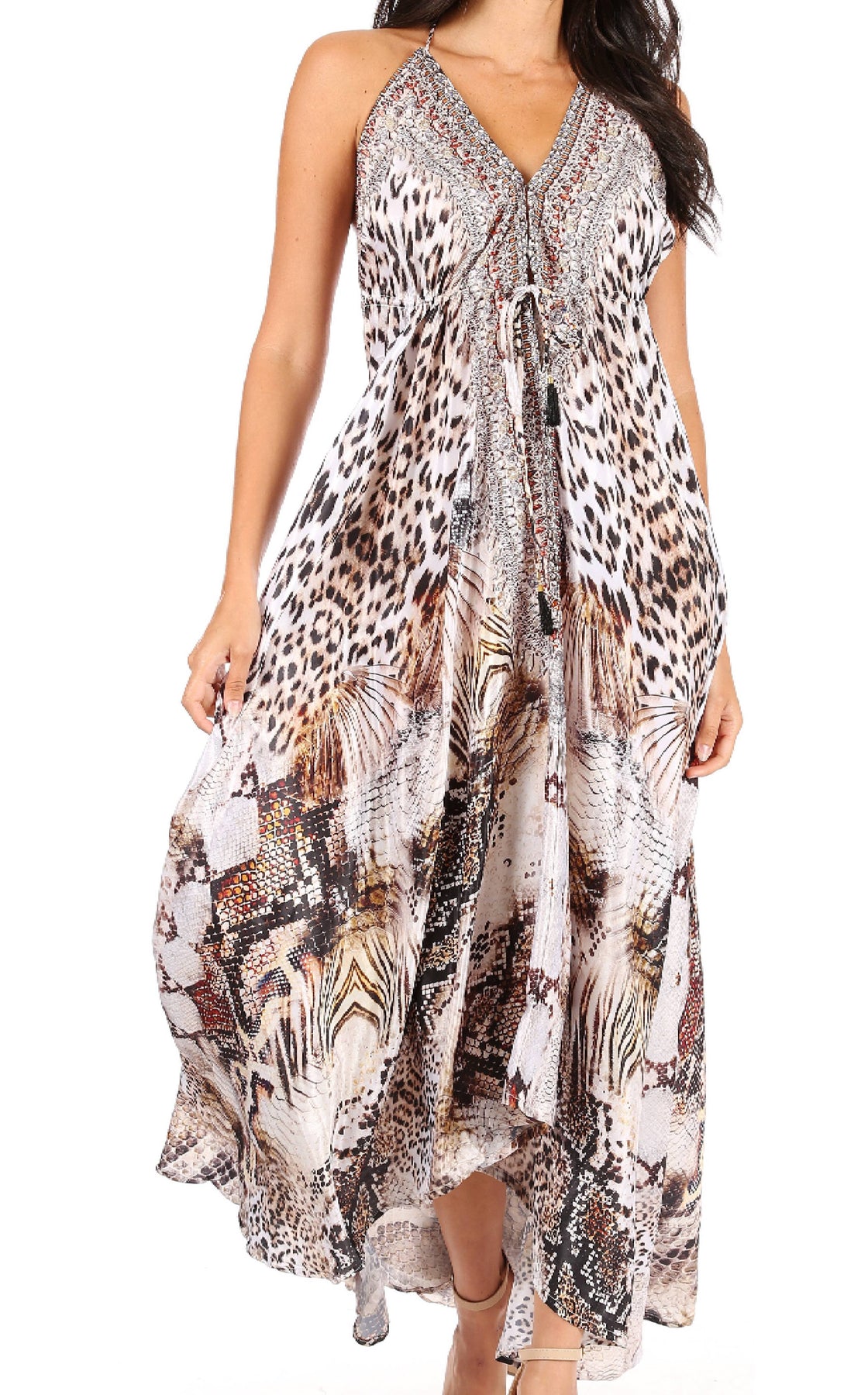 • Striking and dazzling maxi halter dress with embellishment and precious rock like tassels. Silky texture and light as a feather. This lovely dress features a built-in waist and shoulder tie, perfect to accommodate it to your body type. It also features a handkerchief hem and lots of volumes. Ideal for casual wear, brunch, going out, events, weddings and traveling. Feel like a goddess on this flowy and very feminine dress!