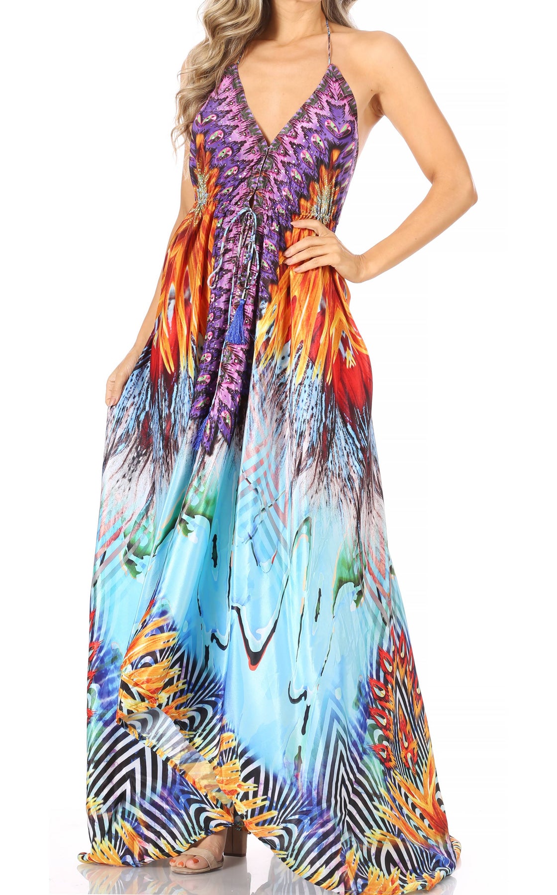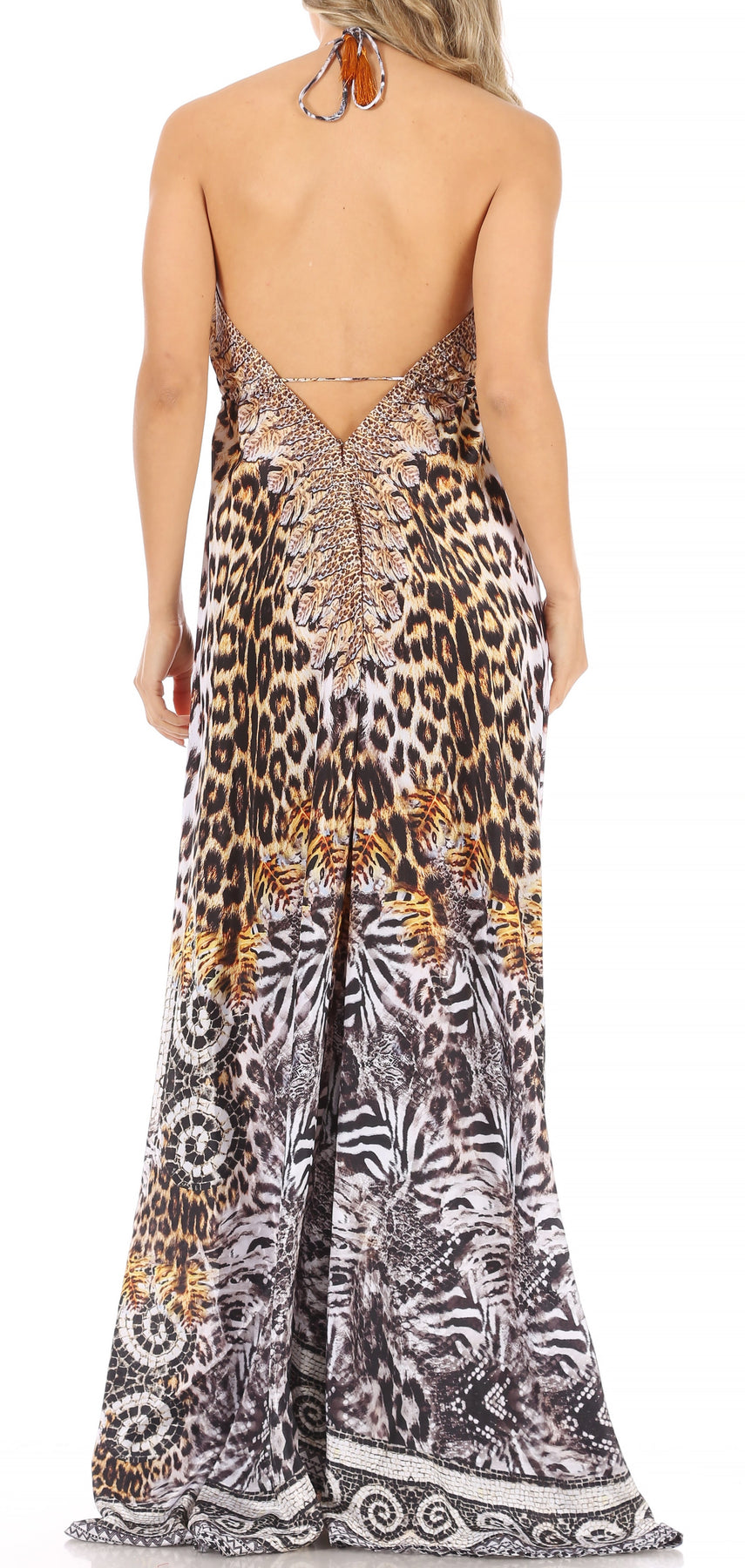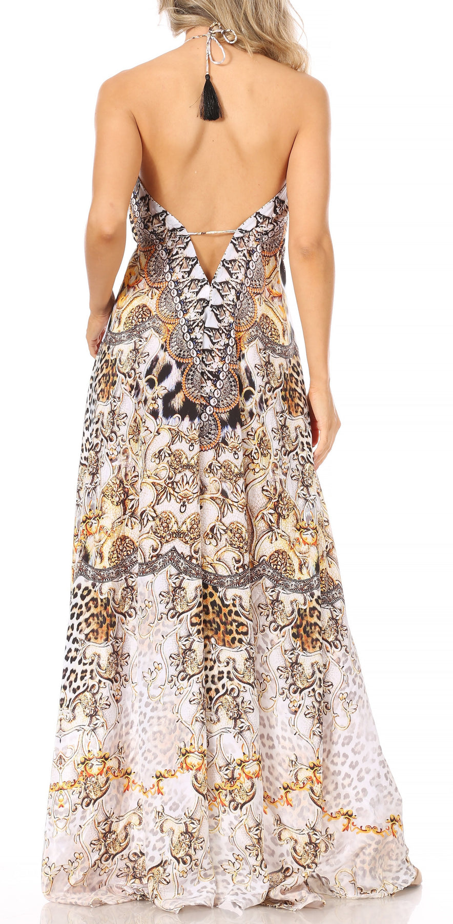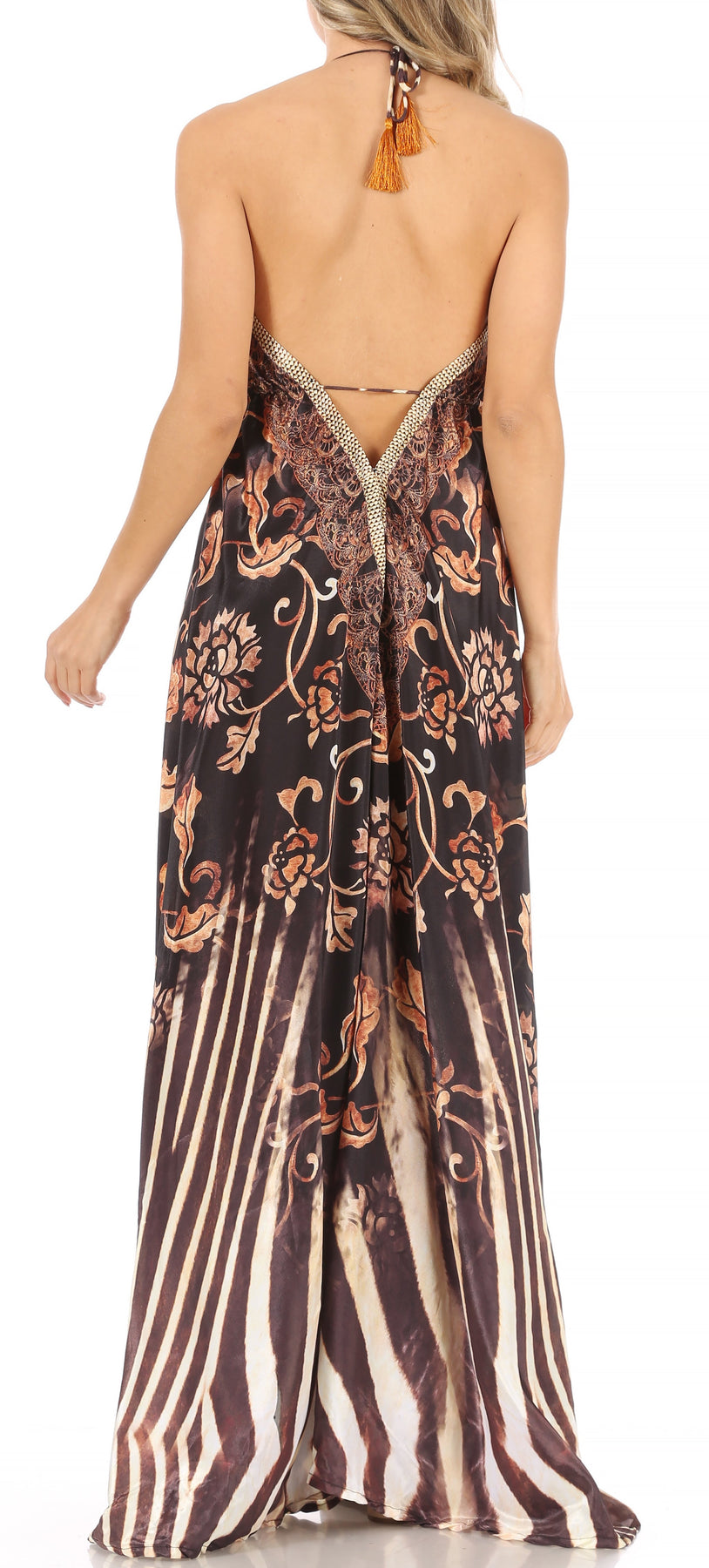 -This lightweight luxurious dress features a beautifully vibrant print and a sexy halter upper. Love the material and the flattering fit. This dress is perfect for casual and formal wear, versatile!