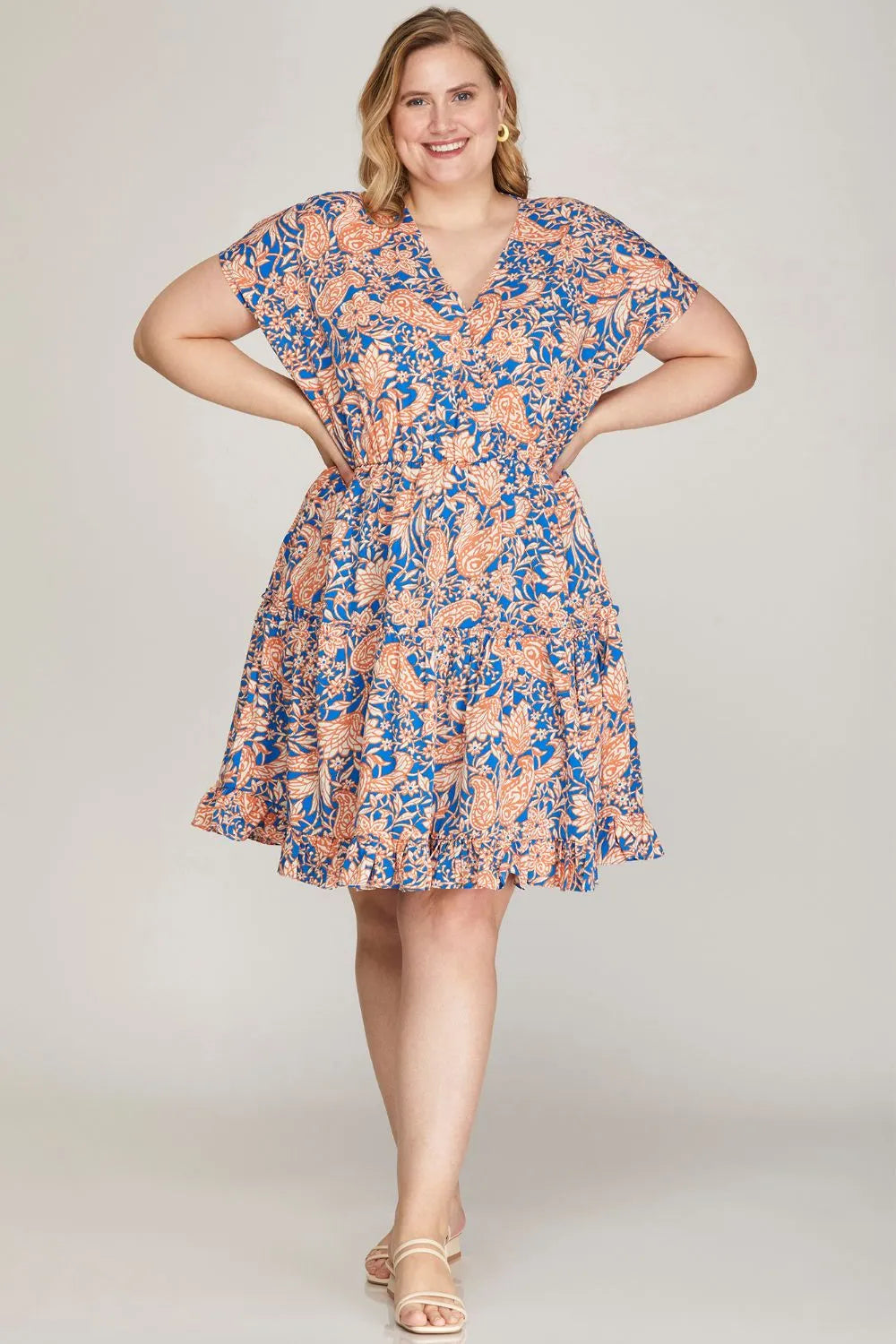 She + Sky Full Size Ruffled Hem Printed Surplice Kimono Sleeve Mini Dress Plus Size