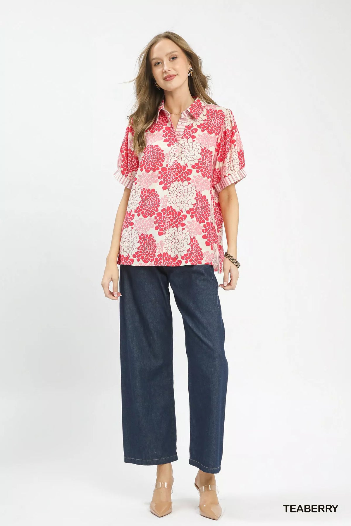 The Floral Collared Short Sleeve Blouse is a charming and versatile piece for your wardrobe. Made from linen, this blouse offers a lightweight and breathable feel. The floral print with multi-stripe contrast adds a cheerful and vibrant touch to the design. Featuring a collared V-placket, this blouse exudes a classic and polished look. The short sleeves with striped contrast cuffs provide a trendy and stylish detail. Perfect for adding a pop of color and femininity to your outfit, the Floral Collared Short Sleeve Blouse is a chic and playful top for various occasions.