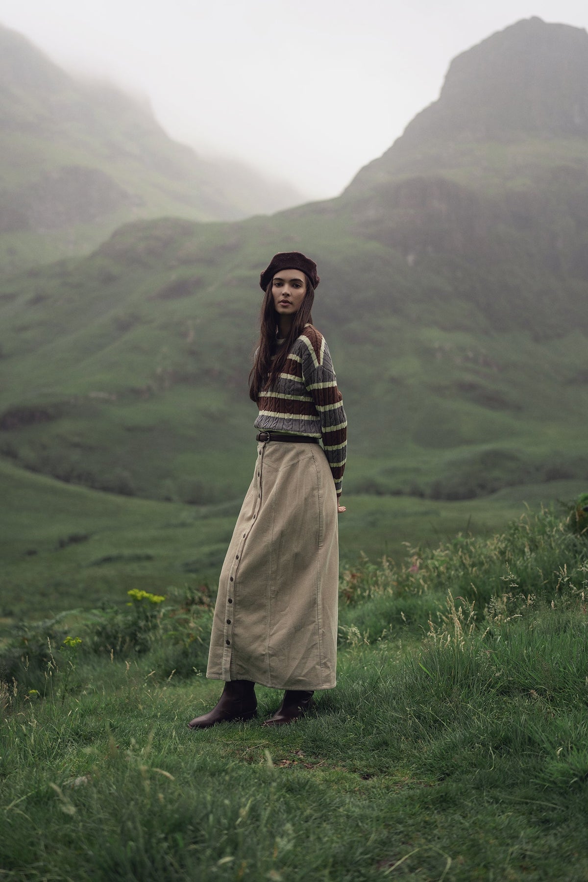 This brown and grey Cable Striped Sweater features a classic knit design and neutral tones, offering comfortable warmth and versatile layering for everyday wear.