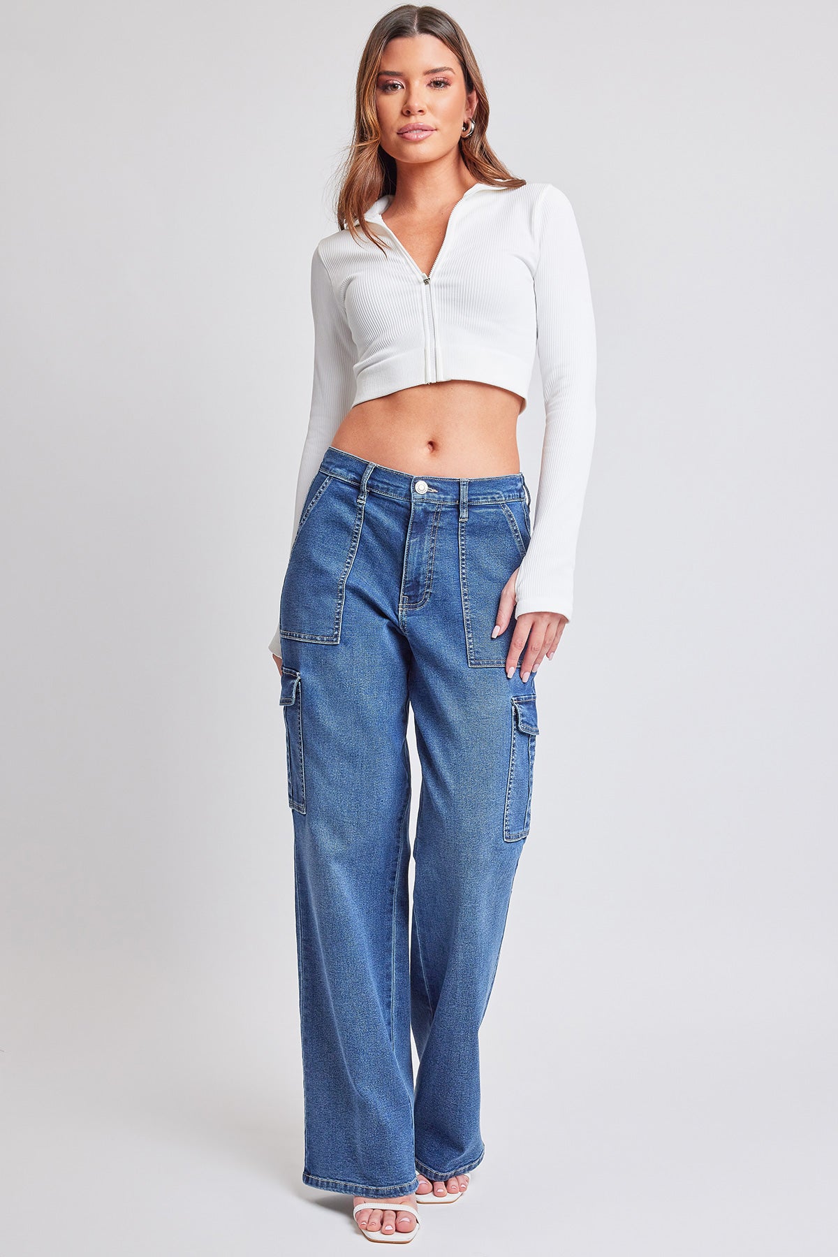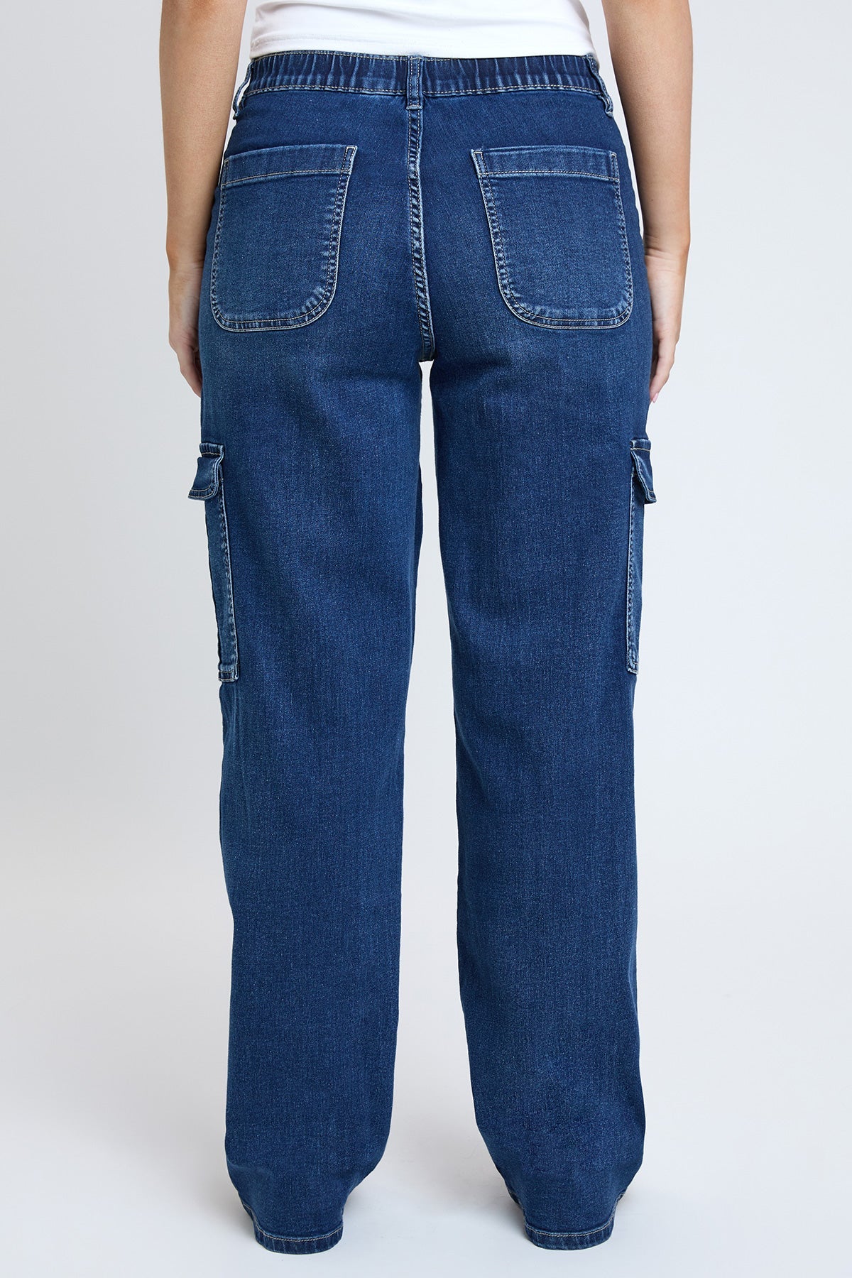Discover our most comfortable denim cargo jeans for women! This stretchy, straight-leg jean features two classic front pockets, back patch pockets, and functional side cargo pockets. Detailed with an elastic waistband for maximum comfort, and a classic zip fly and button closure for an elevated look. The elastic waistband provides maximum comfort and a snatched waist creates the illusion of longer, leaner legs. Our cargo jeans for women feature a straight-leg fit from hip to hem and are full length for a classic street-style cargo jean look. Style these cargos with a fitted crop top and sneakers for a trendy, comfortable streetwear look!