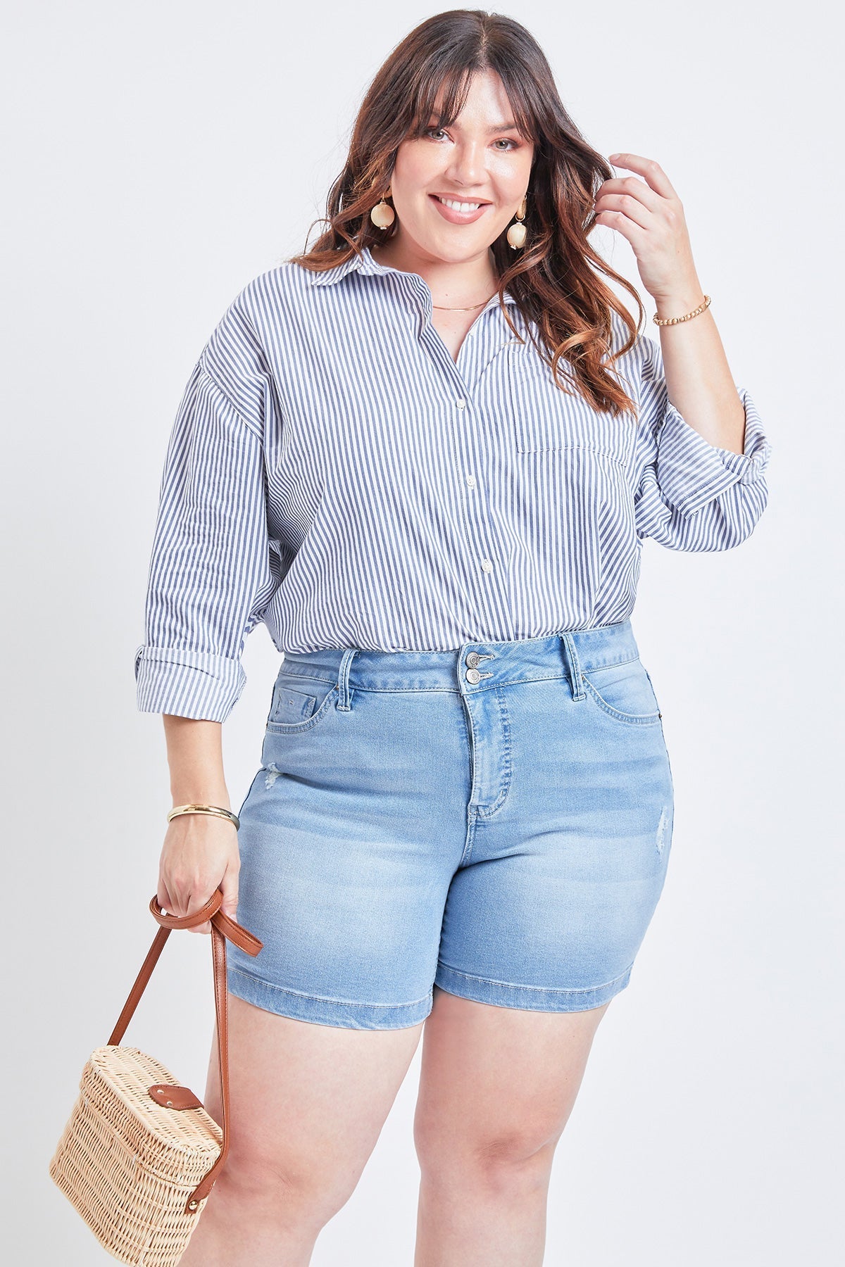 Vintage style with a modern-twist! Our Women Plus Size Basic 2-Button Side Slit Hem Shorts are perfect for the woman who loves the classic look, but wants to add a little edge. Detailed with light front-distressing, whiskering, and an exposed 2-button fly with zipper for the vintage look, but made amazingly comfortable with plenty of stretch and recovery. Made with a high-rise that sits right below the belly button for a flattering fit and side slits for easy movement. We love these shorts styled with a tucked in blouse to show off trendy details, and a strappy or braided sandal to finish off the look!