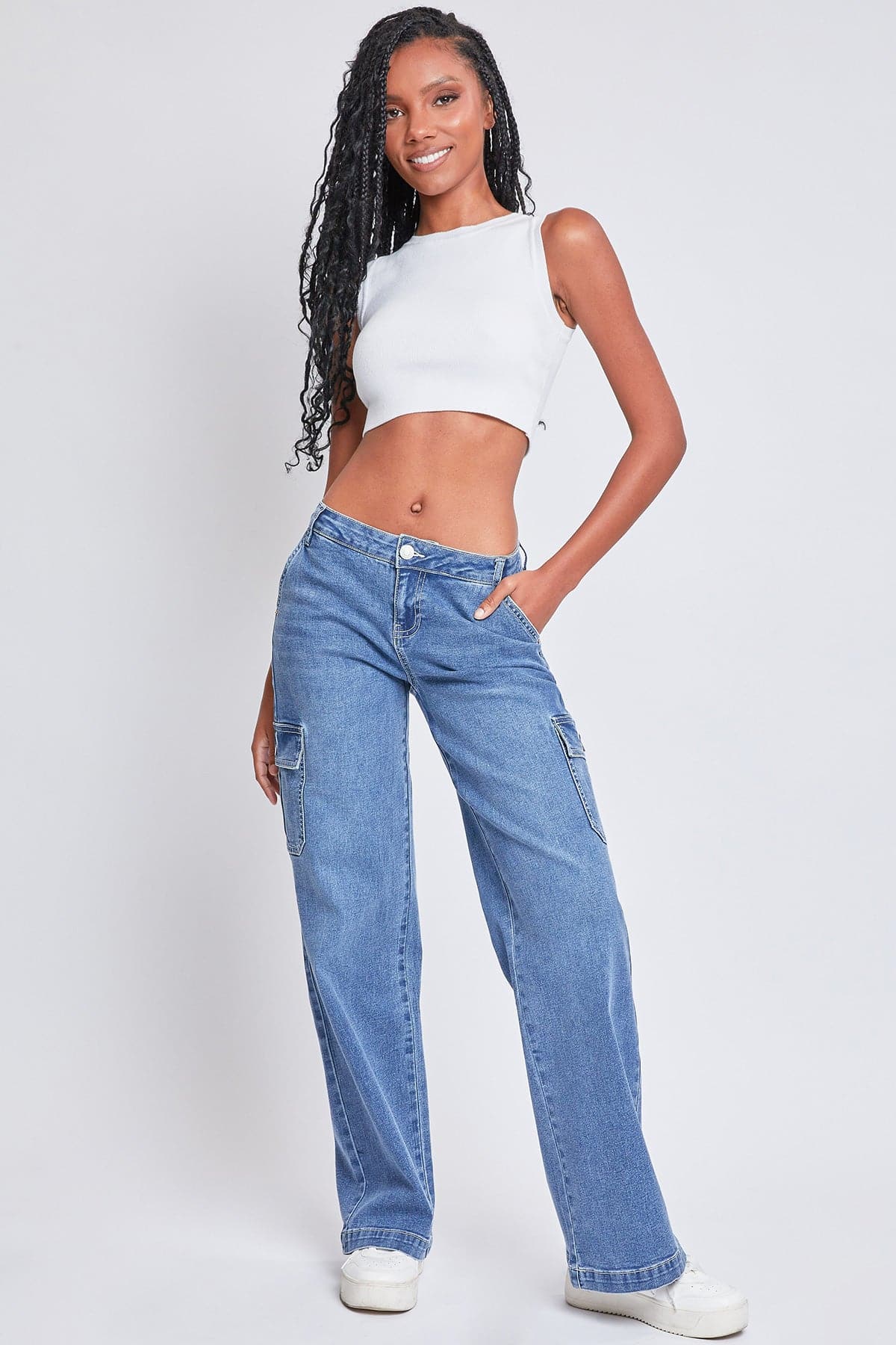 Kick-push your style boundaries and coast in these Women’s Low-Rise Straight Leg Cargo Skater Jeans. This low-waisted jean features a straight leg for a roomy silhouette that’s flattering without sacrificing mobility. Detailed with slant front pockets and flap button-close pockets at the back and side. Wear this trendy denim with a fitted baby tee and sneakers for a stylish look you’ll want to keep on heavy rotation!