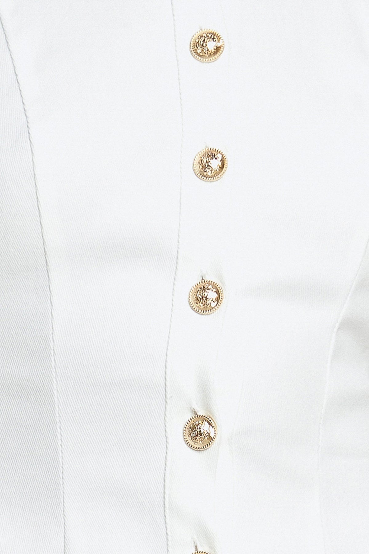 White sleeveless mini dress with a collared neckline, fitted bodice, and gold button front
