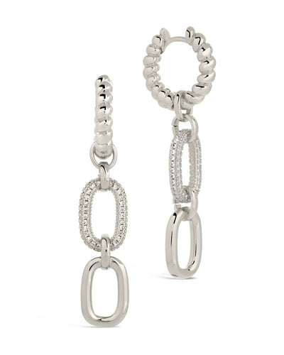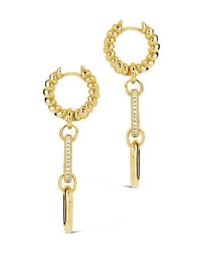 Mixed textures and sparkling CZ stones make these drop hoops a truly unique and striking choice for any fashionista! They feature a pair of dangling links and fasten securely with a post back. Available in gold and silver tones.