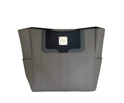 A truly sophisticated Demi Shell with elegance and class. The Aurora Demi shell features a cobblestone faux leather in two shades of gray with contrasting black stitching and black faux leather as the background. Solid gray back with a gray rectangular bottom and side pockets.