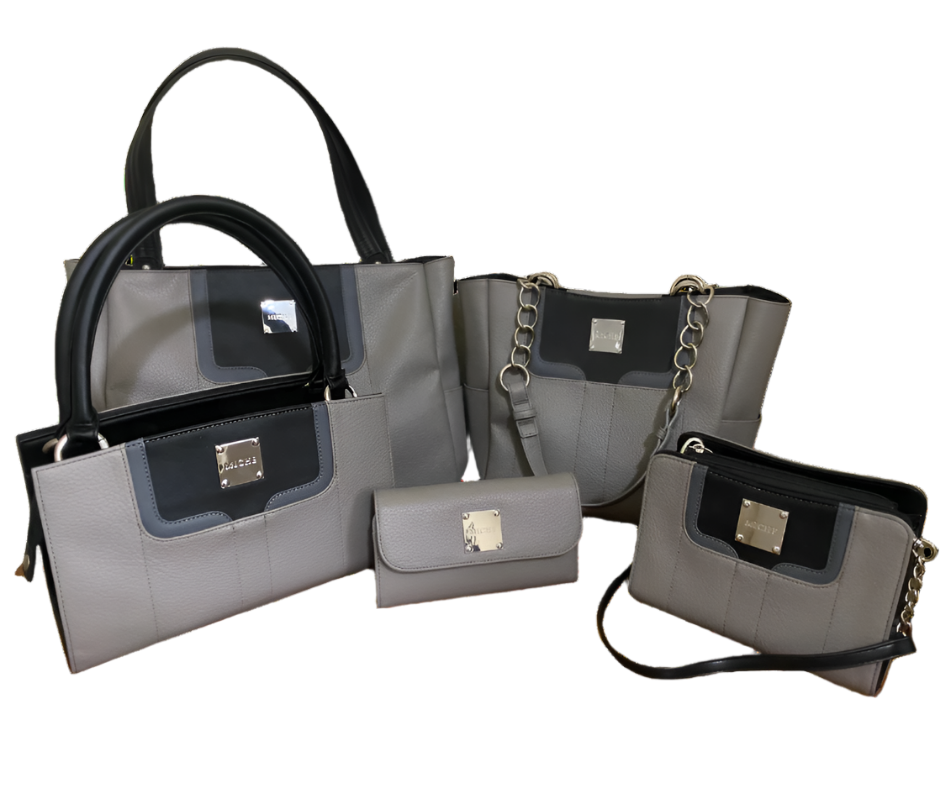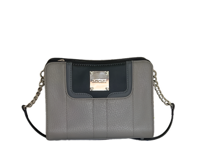 A truly sophisticated Petite Shell with elegance and class. The Aurora Petite shell features a cobblestone faux leather in two shades of gray with contrasting black stitching and black faux leather as the background. Solid gray back with a gray rectangular bottom and side pockets.