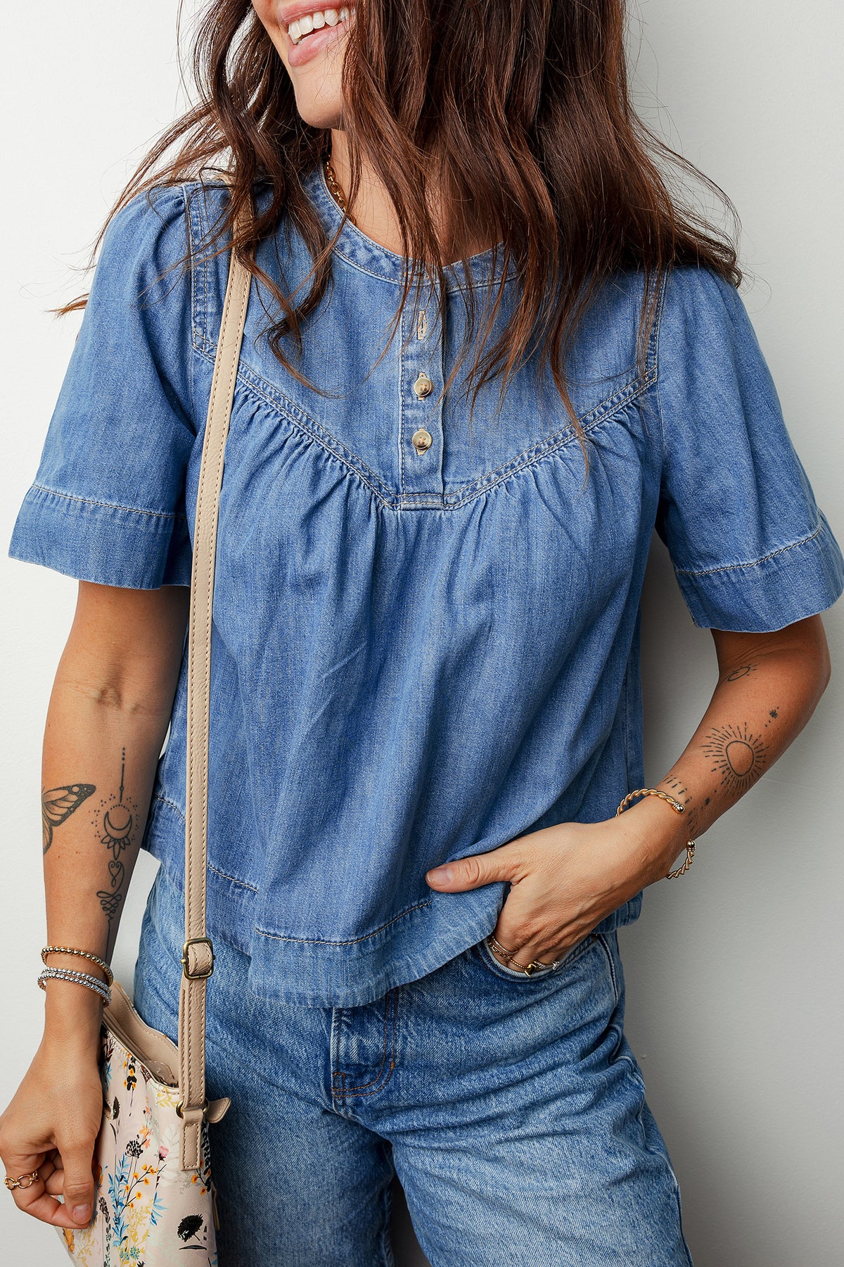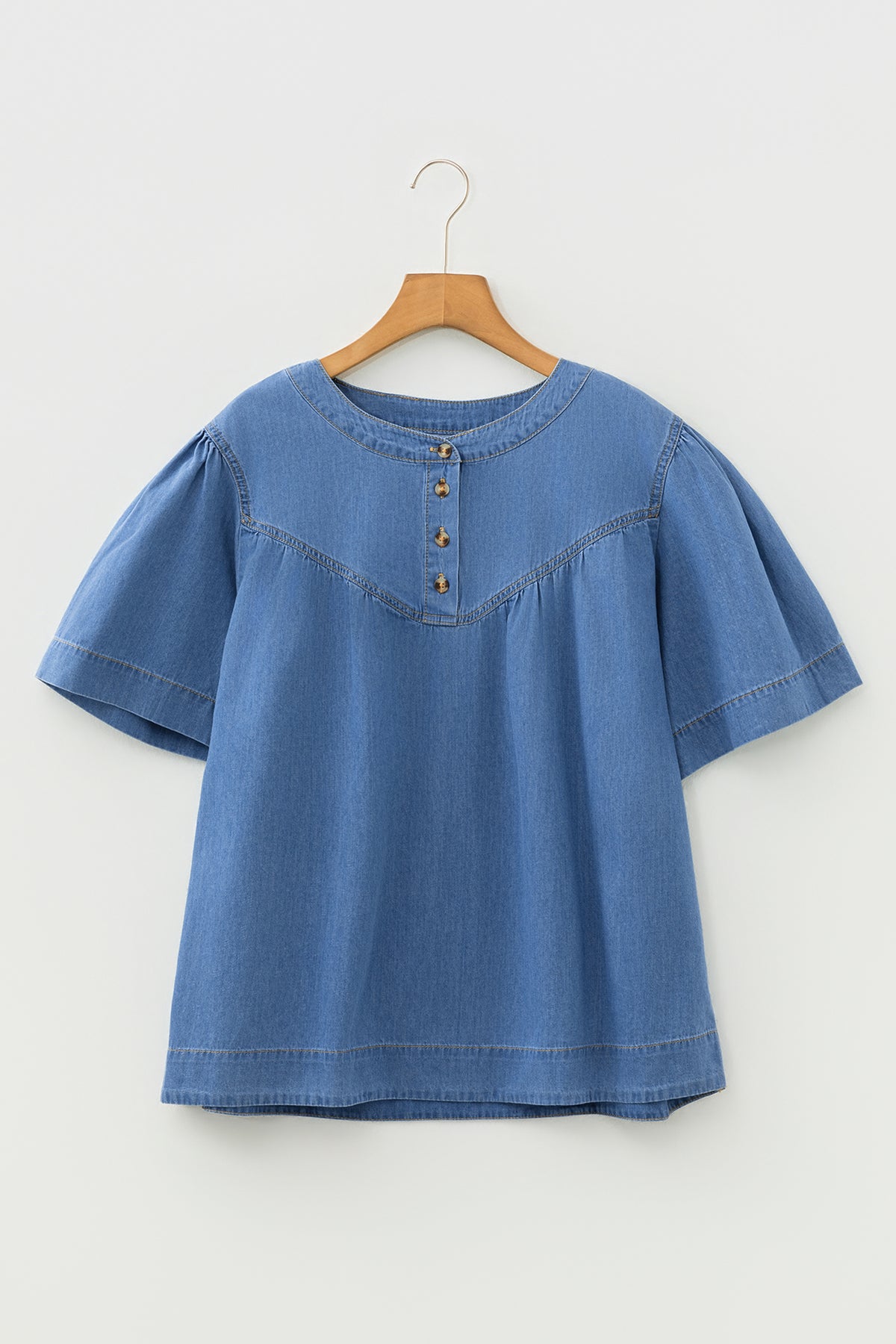 Beau Blue Seam Pleated Detail Half Button Short Sleeve Denim Top