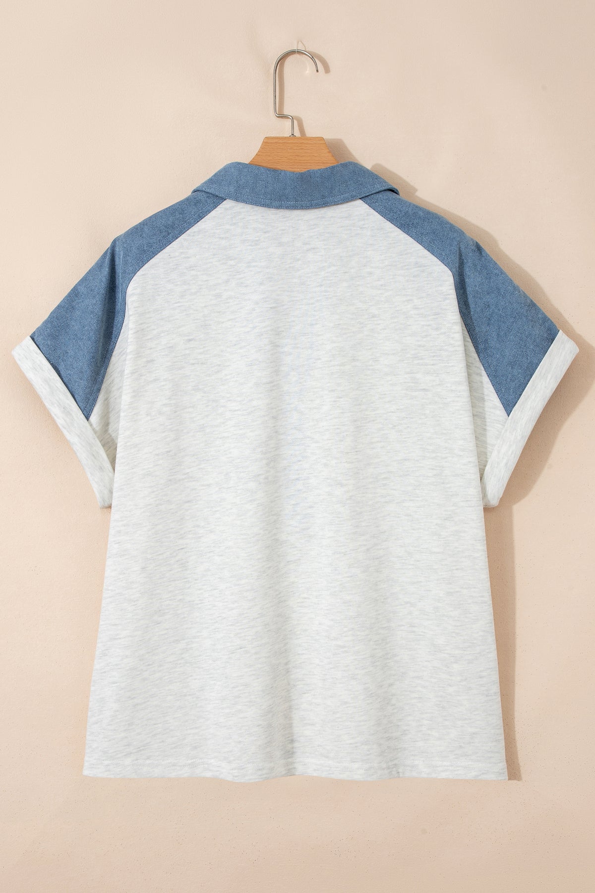 Beige Plus Size Contrast Denim Patchwork Cuffed Sleeve Polo Tee