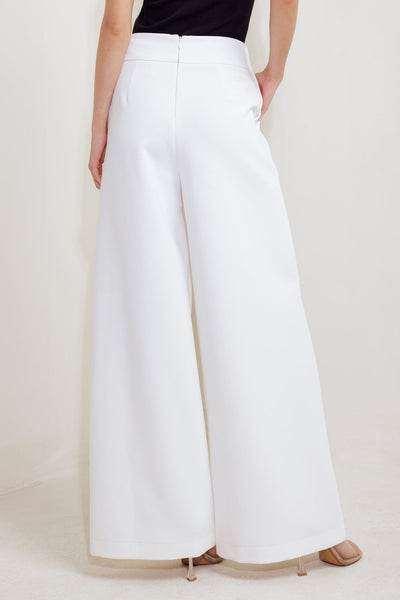 A solid white woven pant featuring side button detail, pockets, wide leg and back zipper closure. Matching vest FJ1251