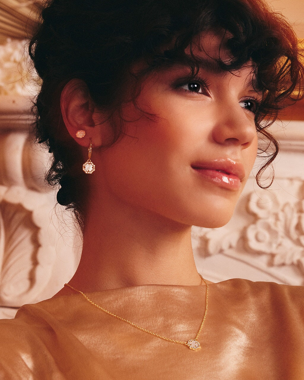 Materials: 14K gold plated brass, cubic zirconia, genuine mother of pearl/created pink opal