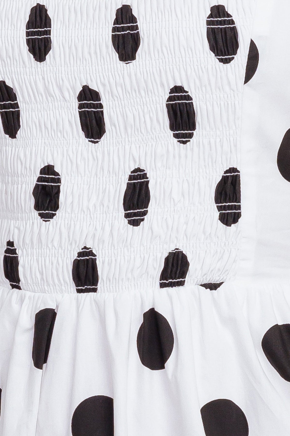 A polka dot, printed woven midi dress featuring, round neckline, cap sleeve, smocked bodice, full skirt and bare back with cross strap
